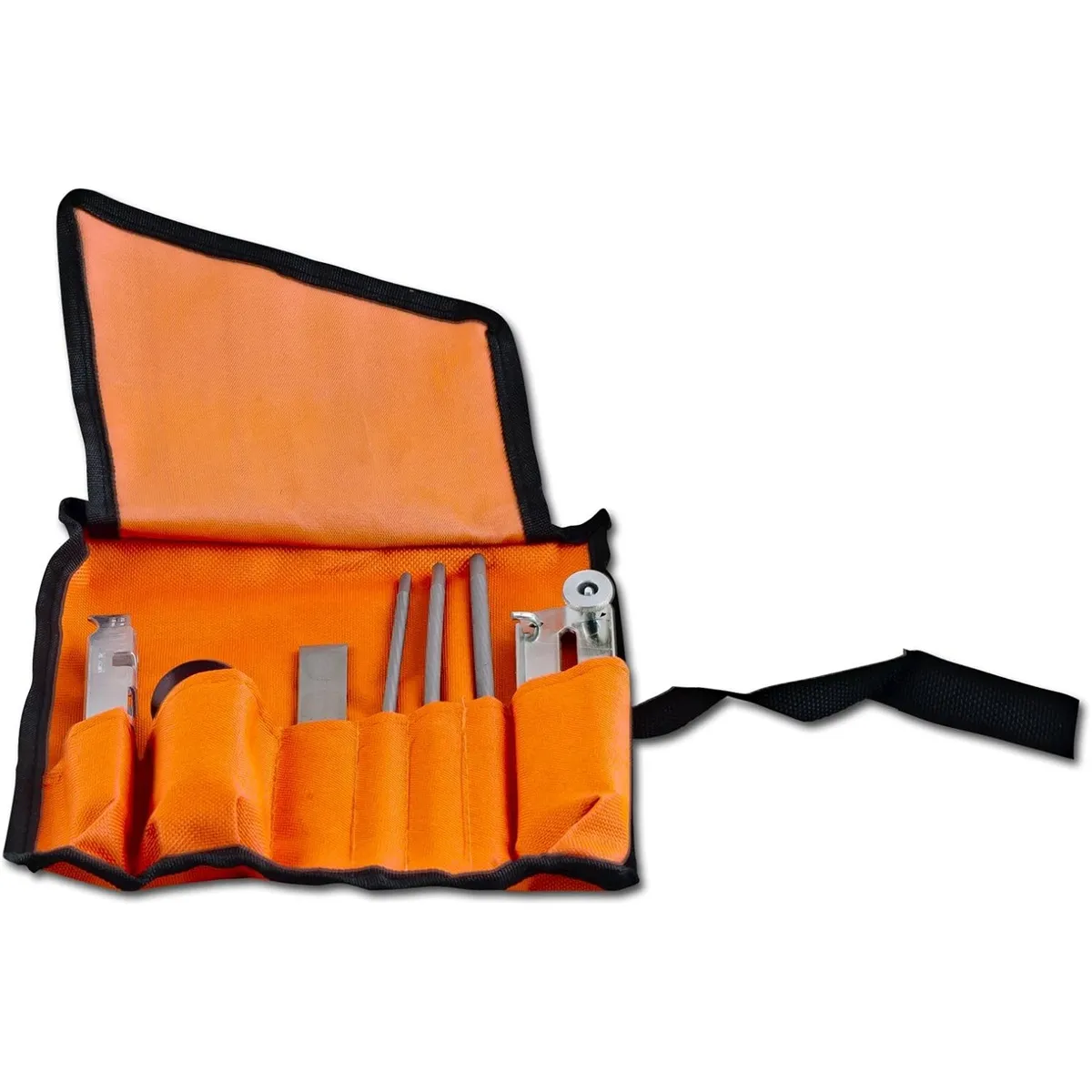 - Univerzální sada pro broušení pilových řetězů a srážení omezovacích zubů Arnold v praktické rolovací brašně.