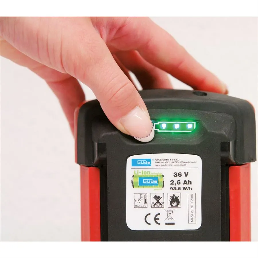 - Akumulátor GÜDE • bez pamětového efektu• LED indikátor stavu nabití Vhodné pro 95540 Akumulátorová sekačka na trávu 370/36 Li-Ion 95650 Sekačka na trávu 370/36 RM 95660 Motorová pila 300/36 Li-Ion 95680 Motorová pila 300/36 Li-Ion Set 95728 Akumulátorová vyvětvovací pila255/36 ASL 95730 Akumulátorové nůžky na živý plot 530/36 HSL 95720 Foukač listí 250/36 LB 95700 Motorová jednotka GME 36 95718 Nůžky na živý plot 540/36 HS 95670 Nabíječka 1A/36 L 95675 Nabíječka 3A/36 L