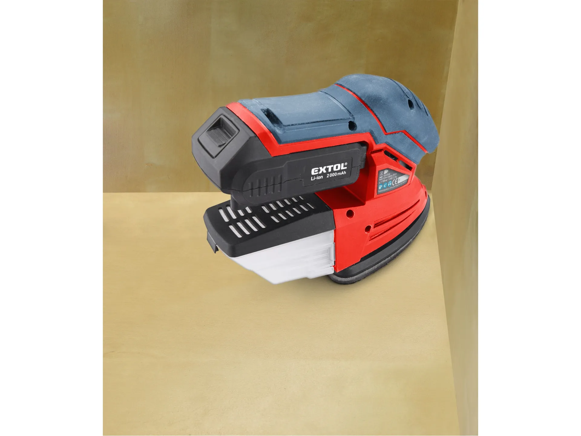 - Aku vibrační bruska je ideální nástroj pro broušení dřeva a dřevěných materiálů, kovů a k zabroušení poškozených míst povrchové úpravy, např. barvy a laku, dále tmelů apod. bez použití vody. Díky svému tvaru je velmi vhodný pro broušení v rohových a obtížně dostupných prostorech. Brusná plocha je vybavena suchým zipem, který umožňuje snadnou výměnu brusných papírů. Integrované odsávání pilin udržuje čistý pracovní prostor při práci a po práci jednoduše vysypete sběrný box a je uklizeno. Pro běžnou práci dostačují jeden nebo dva 2000mAh akumulátory, které můžete rychle nabít v rychlonabíječce, pro náročnější nebo delší práci doporučujeme větší akumulátory s kapacitou 4000–5000mAh. Akumulátor lze použít ve všech typech nářadí řady EXTOL SHARE20V. Díky použité Li-ion technologii je ho možné kdykoliv dobíjet, aniž by se tím snižovala jeho kapacita. Li-ion akumulátor ztrácí energii vlivem samovybíjení velmi pomalu a vydrží dlouho nabitý a připravený k použití.