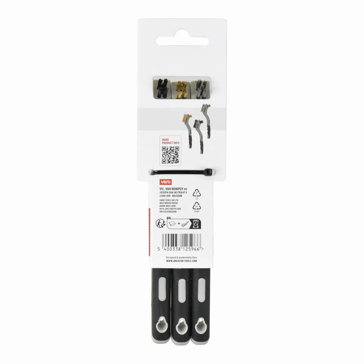 - Tato sada KRTH50101 z naší řady Kreator obsahuje 3 drátěné kartáče s různými typy štětin: nerezové, měděné a nylonové.