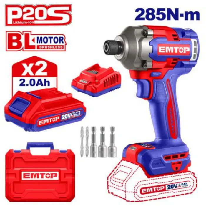 Emtop Aku rázový utahovák 20V 285Nm 1/4" 2x2.0Ah
