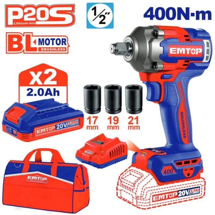 Emtop Aku rázový utahovák 20V 400Nm 1/2" 2x2.0Ah