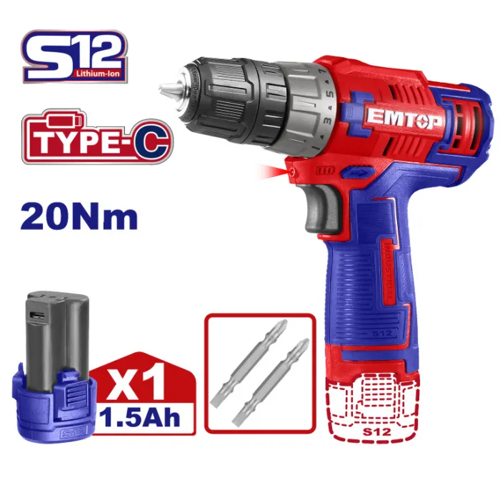 Emtop Aku vrtací šroubovák 12V 20Nm 1x1.5Ah