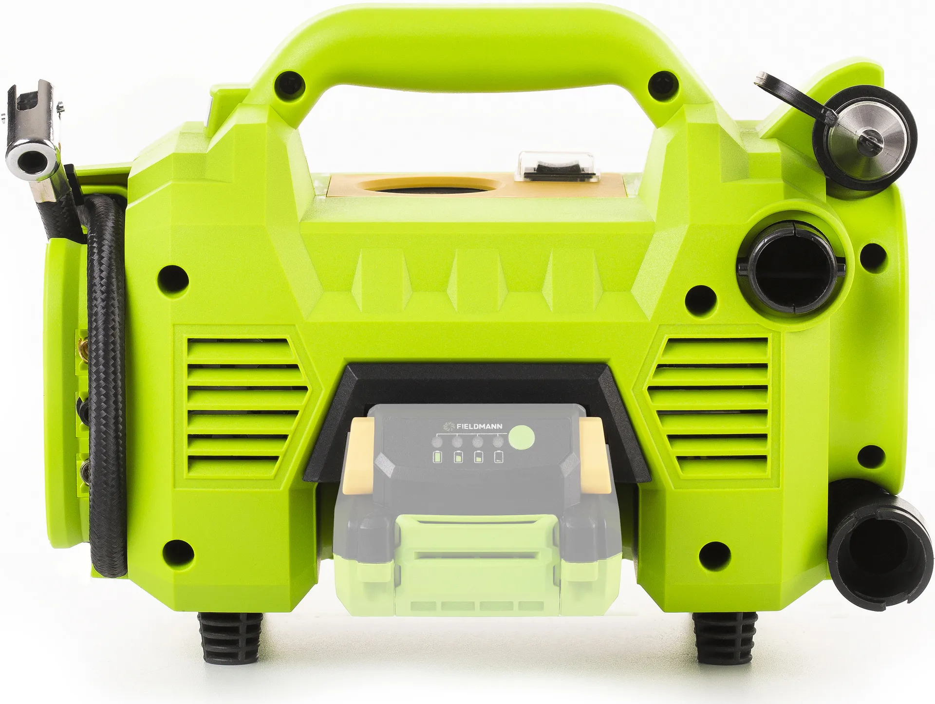 - Akumulátorový kompresor Fieldmann FDAK 70205-0 s maximálním výstupním tlakem 10,3 bar a průtokem vzduchu 235 l/min. Vybaven je ergonomickým držadlem pro snadné přenášení. Nabíječka a baterie nejsou součástí balení.