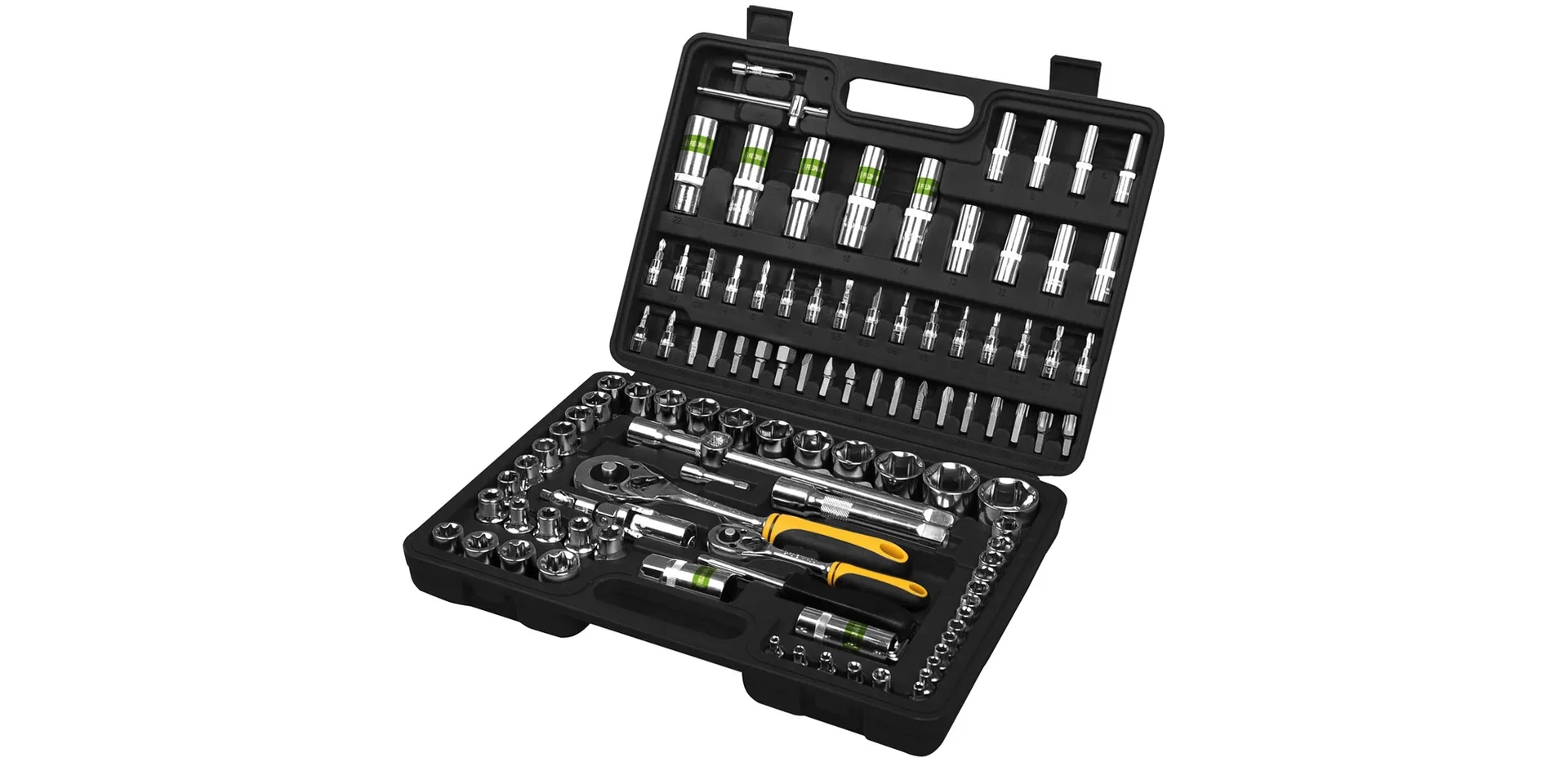 - Gola sada 108 ks, 18x – 1/4" hlavice nástrčná s bity, 8x – 1/4" hlavice nástrčná prodloužená, 5x – 1/4" hlavice nástrčná, 2x – 1/4" prodloužení: 50mm a 75mm 1x – 1/4" kloub ráčnový, 1x – 1/4" trhák, 1x – 1/4" rukojeť šroubovací s vnitřním čtyřhranem, 1x –1/4" ráčna, 17x – 1/2" hlavice nástrčná, 5x – 1/2" hlavice nástrčná prodloužená, 8x – 1/2" hlavice nástrčná, 2x – 1/2" prodloužení: 125mm a 250mm, 1x – 1/2" kloub ráčnový, 1x – 1/2" ráčna, 2x – 1/2" hlavice na svíčky: 16 a 21mm, 3x – klíč imbus: 1.5,2,2.5mm, 1x – adaptér bity, 17x – bity, 1x – kufřík