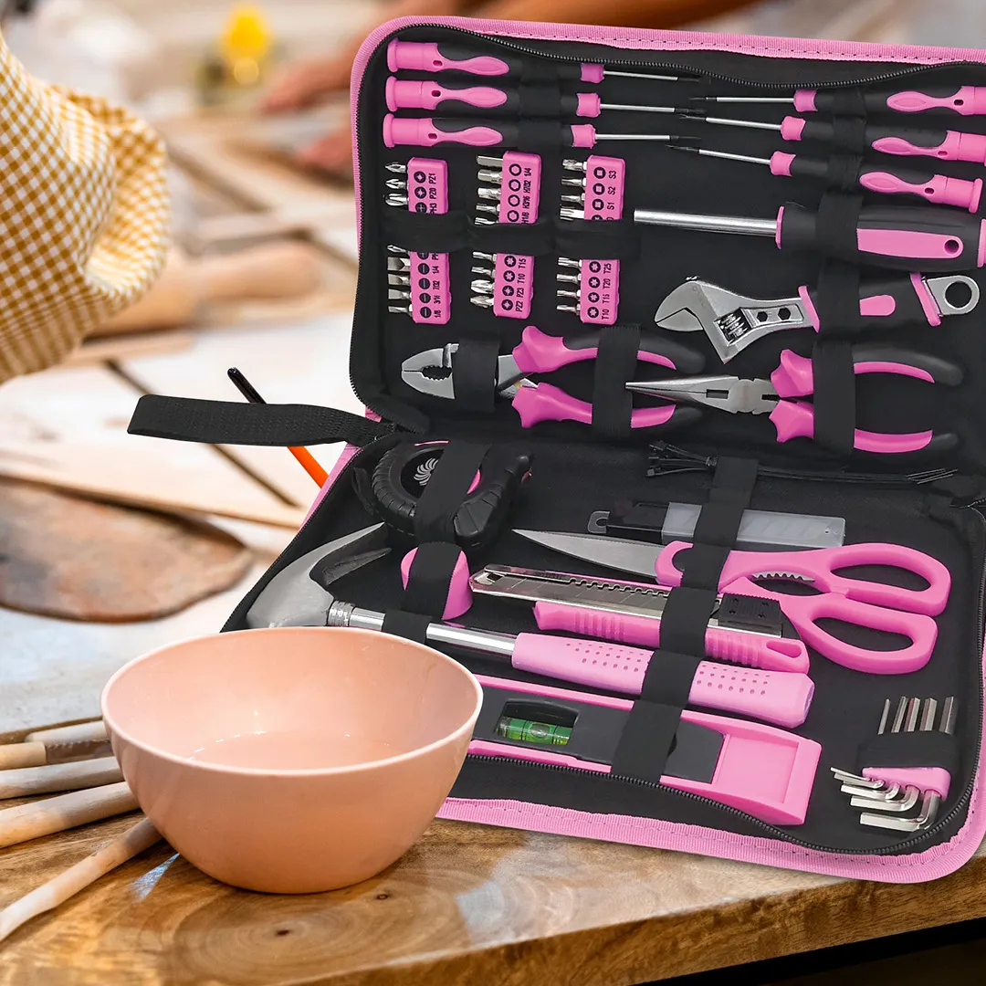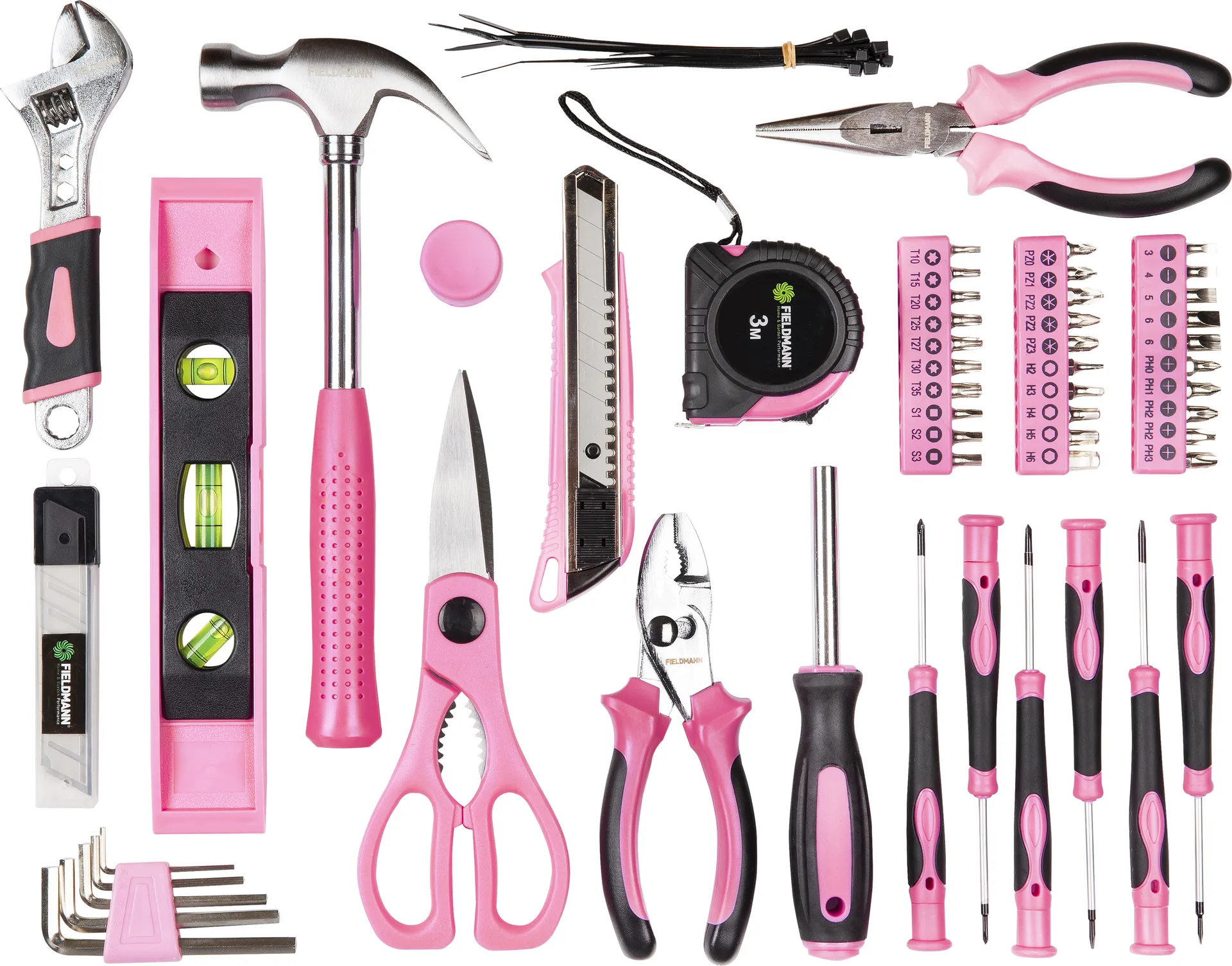 - Stylová růžová brašna FIELDMANN v sobě ukrývá 71 dílnou sadu nářadí, která se bude hodit nejen každé kutilce, ale též každému členu domácnosti nejen v rodinné dílně, ale též na zahradě. Sada obsahuje šroubováky, bity, kladivo, kleště, nožík, svinovací metr,vodováhu a spoustu dalšího vybavení, bez kterého se praktická žena v domácnosti prostě neobejde. Jednotlivé nářadí je vyrobeno z odolného materiálu a opatřeno pohodlnými ergonomické úchopy.