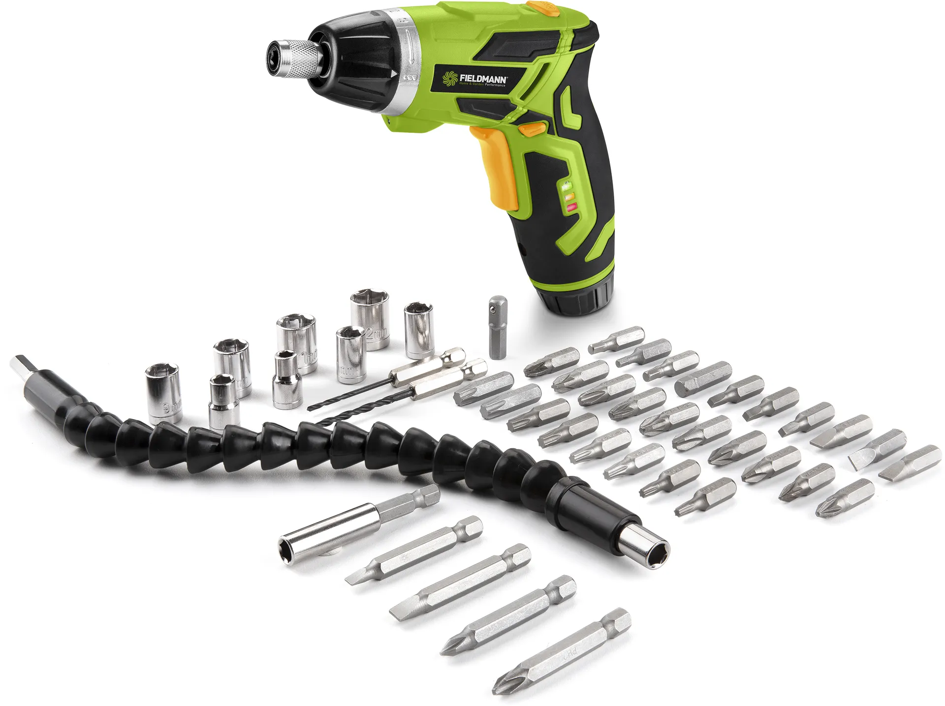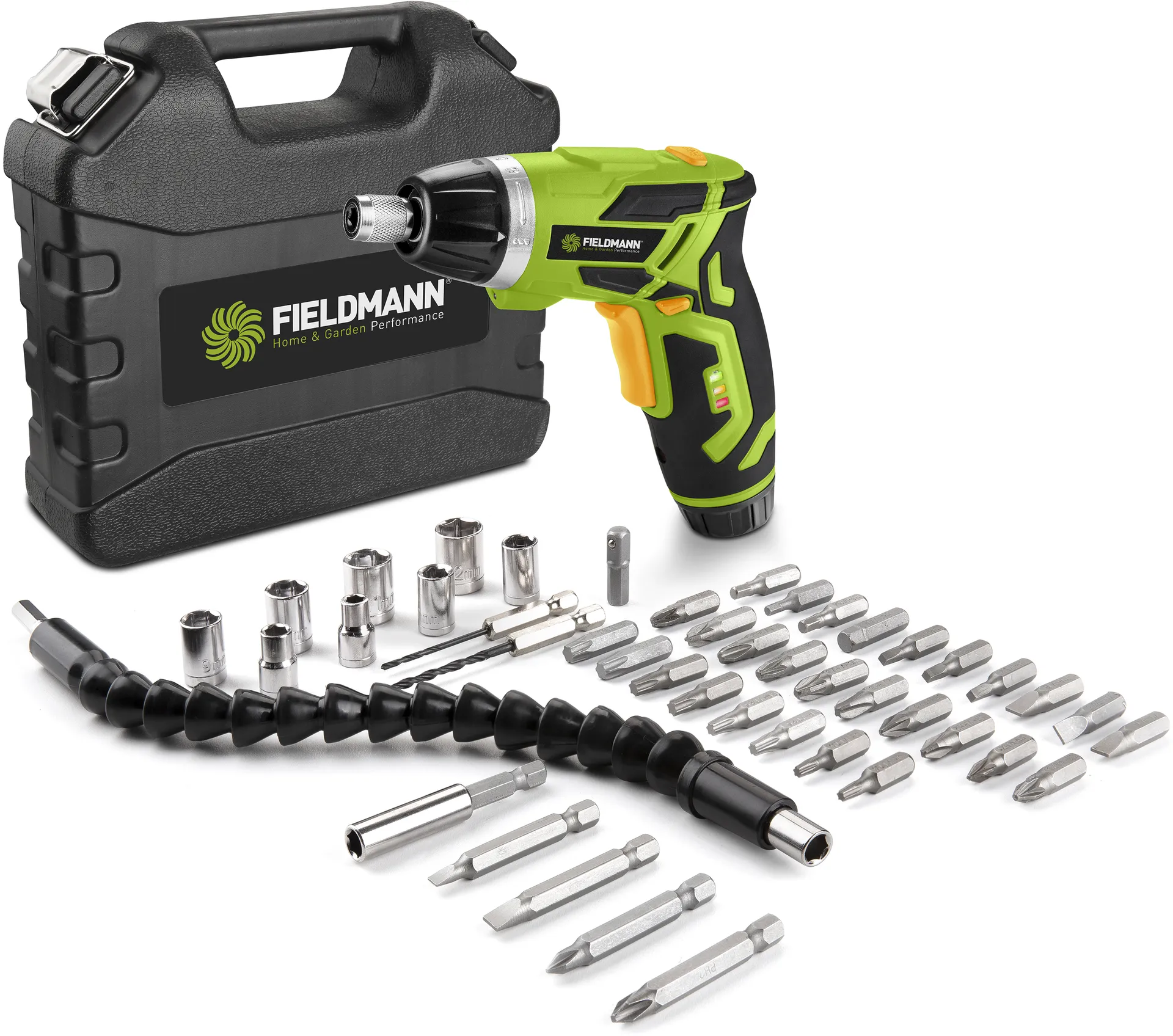- Akumulátorový šroubovák FIELDMANN FDS 10155-A je ideální pomocník pro každého kutila. Šroubovák má pohodlnou ergonomickou rukojeť s měkkým obložením a nabízí výkon 230 otáček za minutu, takže je ideální propřesnou práci. K dalším funkcím šroubováku patří LED osvětlení pracovní plochy doplněné o výkonnou LED svítilnu v rukojeti. Mezi další plusy patří možnost přepnutí směru otáček a indikátor stavu nabití baterie. Akumulátor nabijete snadno pomocí dodávaného USB kabelu.