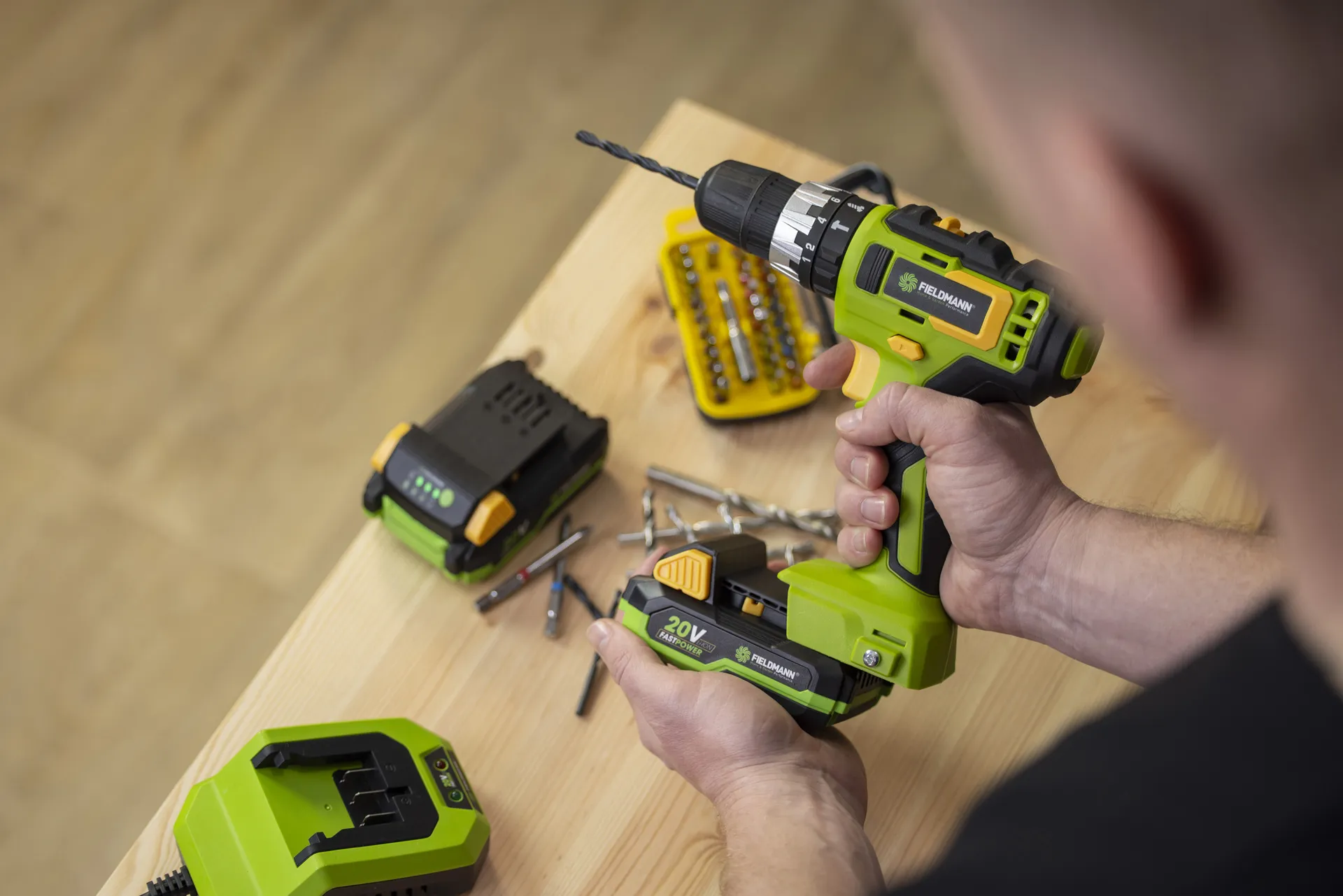 - Akumulátorová vrtačka s funkcí příklepu od renomovaného výrobce FIELDMANN zajistí maximálně pohodlné a rychlé vrtání / šroubování bez překážejícího kabelu. Aku vrtačka dosahuje dostatečného výkonu díky plnému využití síly 1 x 20V akumulátoru ve spojení s elektronickou řídící jednotkou a maximálním kroutícím momentem 35 N.m. O komfortní práci se kromě ergonomické rukojeti stará též pracovní LED světlo díky kterému bude jakákoliv práce v dílně snazší. Je možno použít akumulátory o kapacitách 2Ah/4Ah které jsou kompatibilní do všech výrobků společnosti FIELDMANN řady FAST POWER 20V.