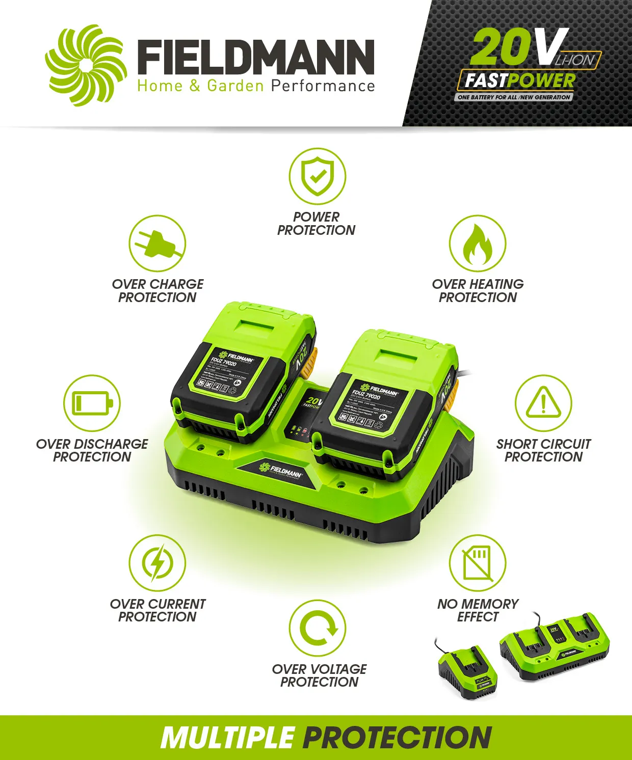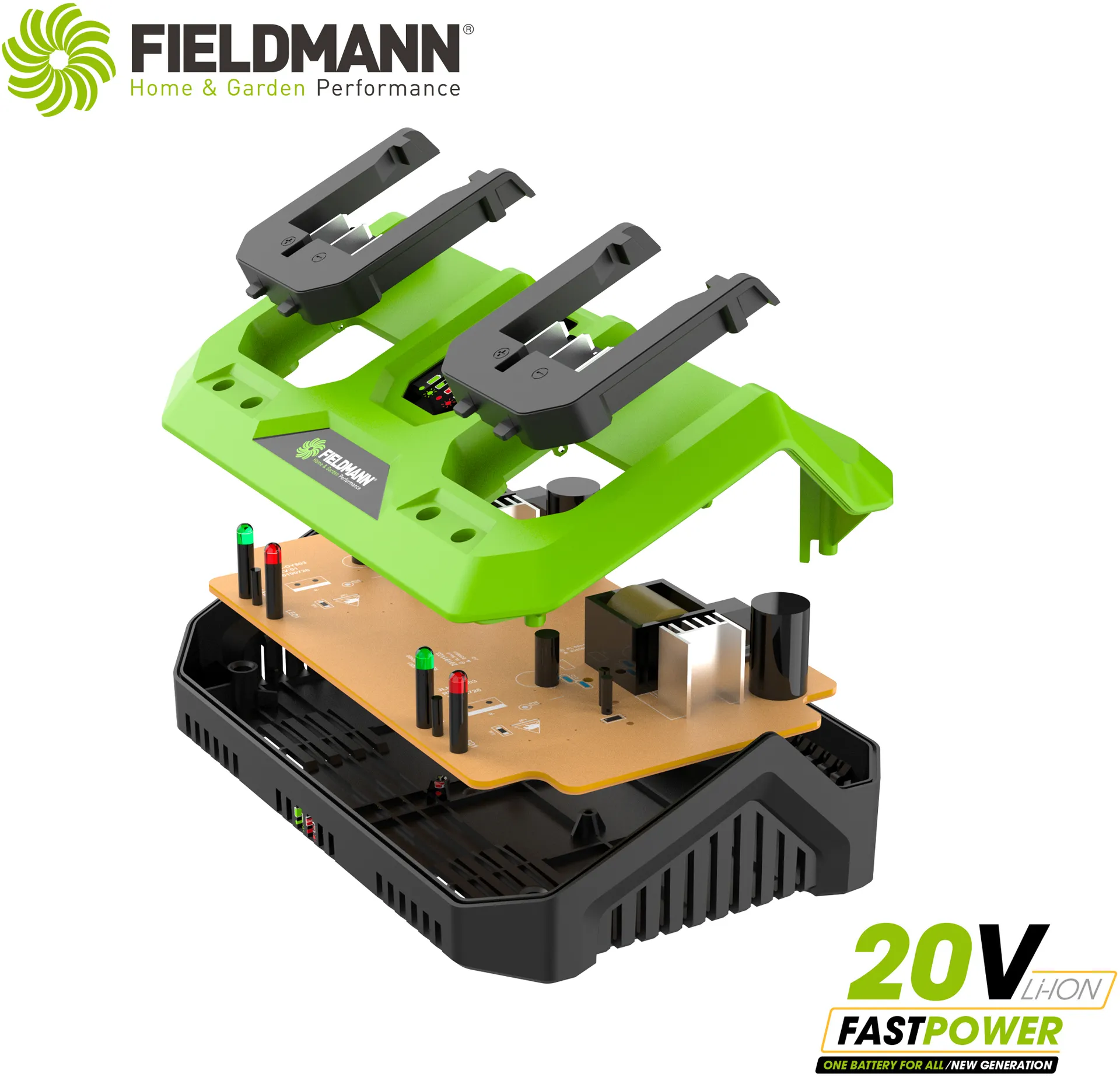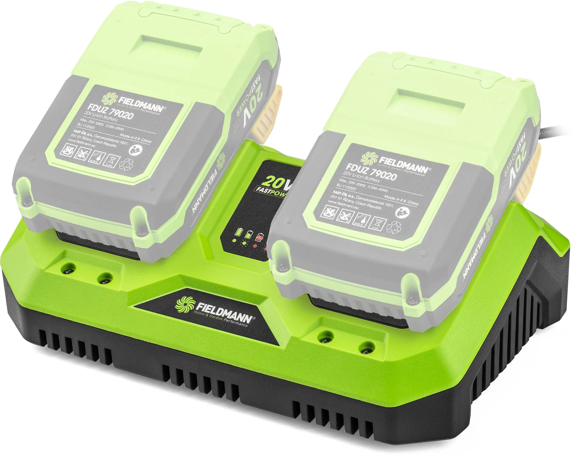 - Li-Ion duální rychlonabíjecí stanice renomované značky FIELDMANN představuje opravdovou špičku ve své komoditě. Je kompatibilní se všemi stroji z aku řady FAST POWER 20V. Pro tento druh nabíječek je typický elektronický monitoring stavu nabití díky kterému ihned vidíte, zda nabíjení probíhá bez problému díky LED indikátoru. Největší výhodou této nabíječky je možnost nabíjení 2 baterií současně.