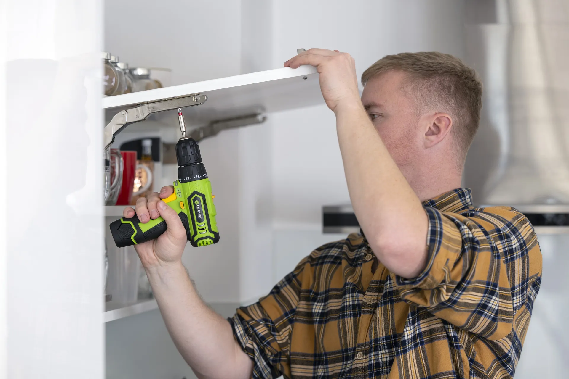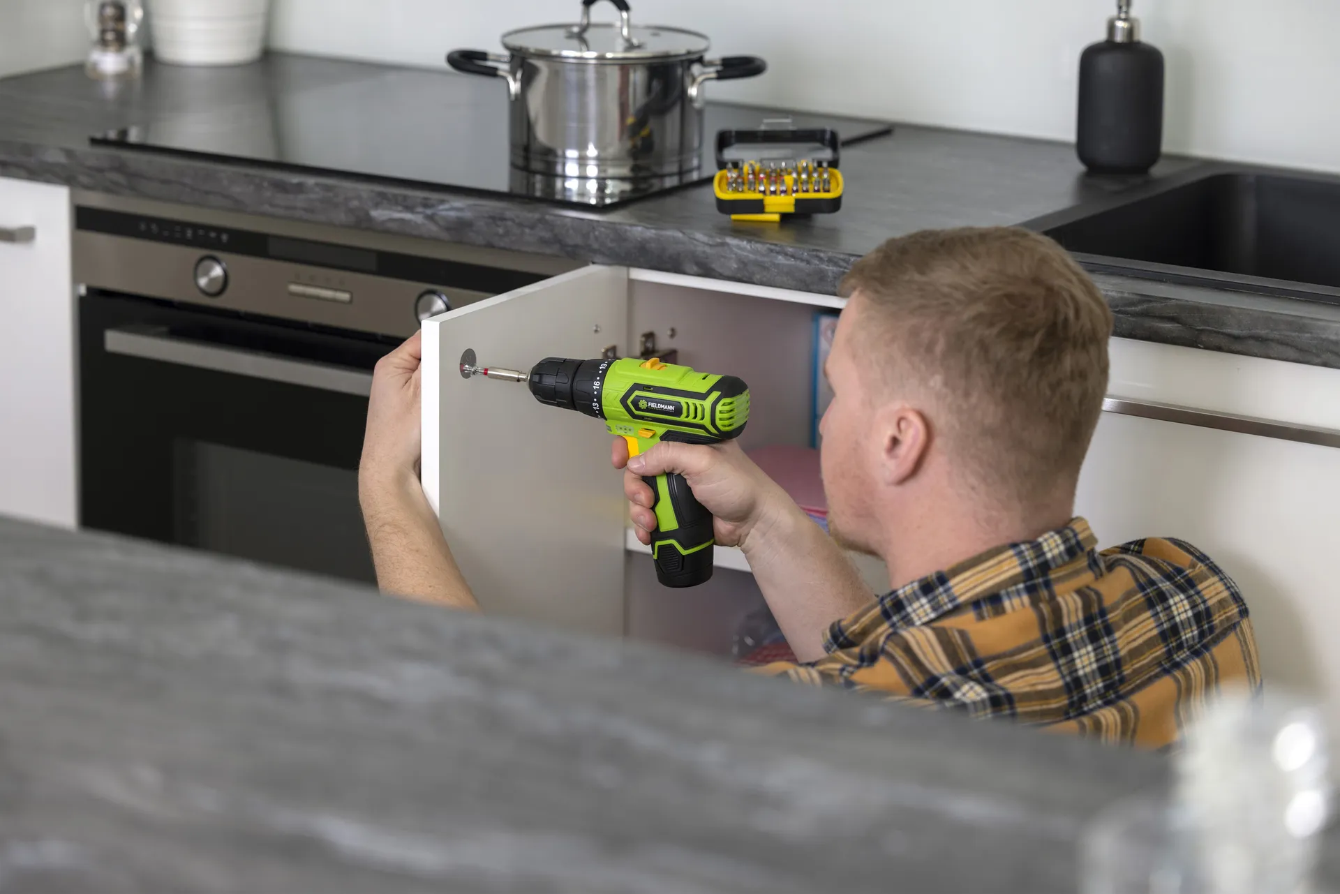 - 12V vrtačka s ergonomickou rukojetí ve které je zabudovaná výměnná baterie