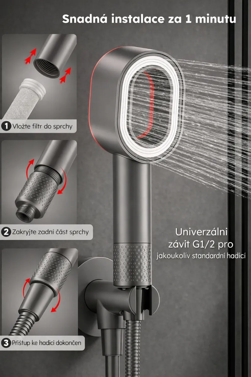 - Jednoduchá instalace do sprchové hlavice