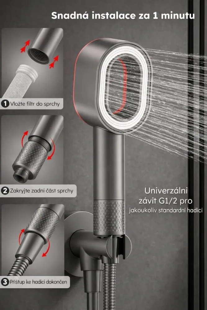 - Peelingová houba šetrně odstraňuje odumřelé kožní buňky a nečistoty, zanechává pokožku hladší a svěžejší – ideální jako rychlý domácí peeling během sprchování.Hlavní benefityNerezový panel plus 392 mikrotrysek (0,25 mm)Plné pokrytí a příjemný proud i při nízkém tlaku vodyOdolné, lehké tělo z prémiového ABSLuxusní matný vzhled a protiskluzová ergonomická rukojeťSnadná instalace – bez instalatérských pracíCo je doopravdy ve vaší sprchové vodě?Vaše voda může vypadat čistě, ale může skrývat neviditelná rizika, která nenápadně, ale významně poškozují vaši pokožku a vlasy:Chlor ve vodě – vysušuje pokožku a způsobuje podrážděníTvrdá voda – usazeniny snižují hydrataci a zhoršují kvalitu vlasůTěžké kovy (olovo, měď, rtuť) – dráždí citlivou pokožku a mohou se hromadit v tělePesticidy – narušují hormonální rovnováhu a způsobují citlivost pokožkyRez a usazeniny – pronikají z potrubí a znečišťují voduMikroorganismy – zvyšují riziko infekcí a kožních zánětůMikroplasty – brání přirozené regeneraci pokožkyGLOX filtrační systém – čistá voda pro zdravou pokožkuACF filtr je navržen tak, aby účinně redukoval škodlivé látky ve vaší vodě.