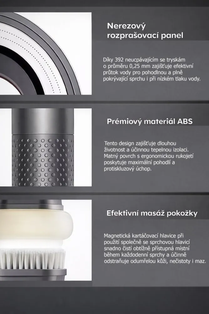 - Zažijte dokonalou sprchovou kúru, která každý den revitalizuje vaši pokožku, vlasy i smysly.Prémiový proud vody, který si zamilujeteLuxusní sprchová hlavice s nerezovým panelem a hustou sítí 392 mikrotrysek (0,25 mm) vytváří jemný, rovnoměrný a přitom účinný proud vody – pro pocit plného pokrytí i při nižším tlaku.Péče o pokožku: magnetický kartáč plus peelingová houbaMagnetický kartáč pomáhá snadno vyčistit hůře dostupná místa a zároveň pokožku jemně promasíruje.