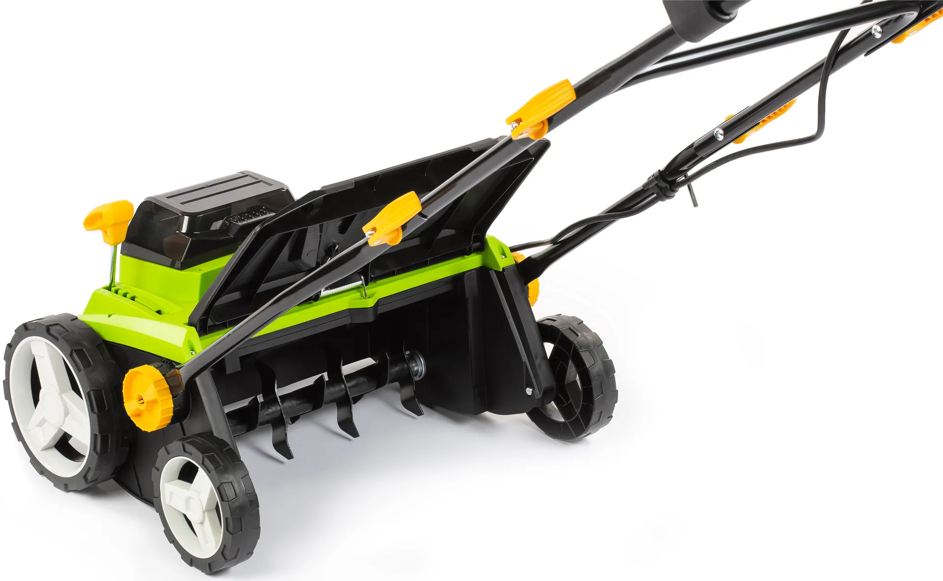 - Pokud chcete mít trávník v dobrém stavu, tak jej nestačí pouze sekat a občas pohnojit, ale je vhodné poskytnout mu dodatečnou péči pomocí vertikutátoru, který trávník provzdušní a zbaví ho odumřelých částí či mechu. Pryč jsou doby, kdy bylo možné vybírat pouze mezi nepohodlností prodlužovacího kabelu či zplodin ze spalovacího motoru. Oba problémy vyřeší nejmodernější bezuhlíkový motor našeho AKU vertikutátoru. Stroj disponuje 16 noži při záběru 38cm. Nastavení pracovní hloubky se provádí centrálně v pěti pozicích v rozmezí od -12 do +6 mm. To vše ve spojení s dostatečným výkonem, kterého je dosáhnuto při plném využití síly 2× 20 V baterií. Samozřejmostí našeho vertikutátoru jsou baterie z programu FAST POWER 20 V, které lze použít do všech strojů naší aku řady. Stroj je dodáván samostatně, bez baterie a nabíječky.