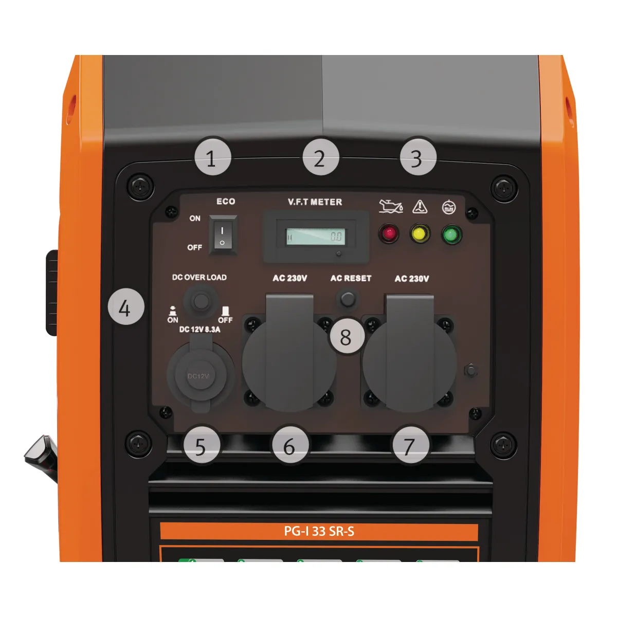 - Kontrolky výstupního napětí, přetížení a nedostatku oleje