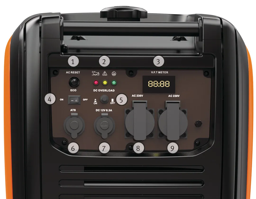 - Kontrolky výstupního napětí, přetížení a nedostatku oleje