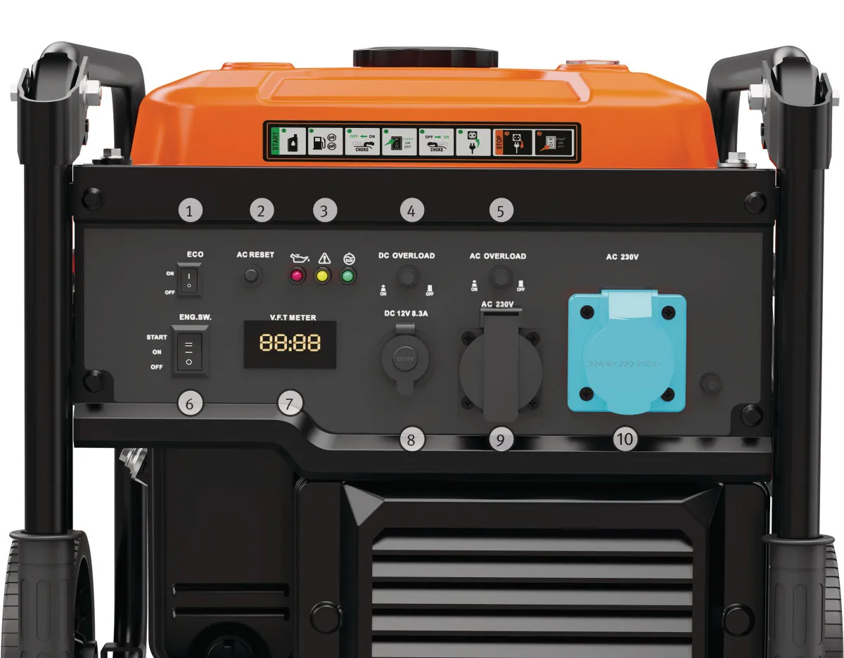 - El. zásuvky: 1× 230 V / 16 A1× 230 V / 32 A1× 12 V DC / 8,3 A