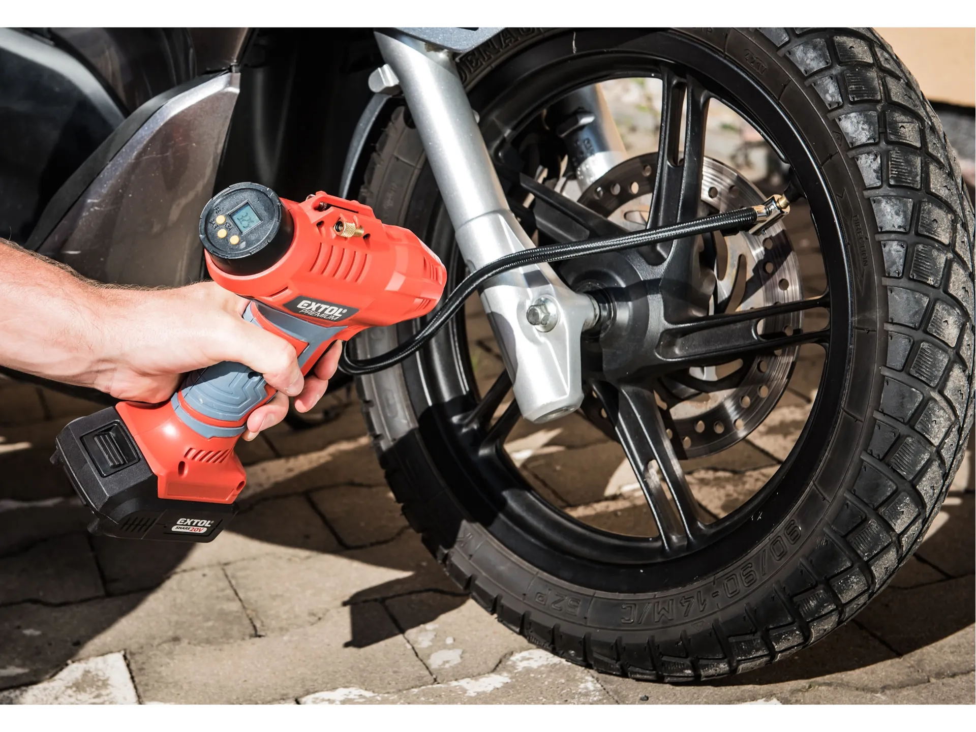 - Výkonný a silný plnící aku kompresor, je určen ke kontrole a k doplnění tlaku pneumatik osobních a užitkových automobilů, motorek a cyklistických kol na předepsaný tlak a s dodávaným příslušenstvím také k nafouknutí sportovních míčů, lehátek, matrací apod. Na displeji kompresoru si můžete jednoduše zvolit tlak v bar, psi, kPa a kompresor se automaticky při dosažení této hodnoty zastaví. Pro práci ve tmě je tento displej podsvícený a kompresor má světlo, které svítí i když kompresor není zapnutý. Spínač kompresoru je vybaven pojistkou proti samovolnému spuštění a zámkem, kterým můžete zaaretovat spínač v poloze zapnuto. Samotný kompresor uvnitř stroje má celokovovou konstrukci zajišťující dlouhou životnost. Pro běžnou práci dostačují jeden nebo dva 2000mAh akumulátory, které můžete rychle nabít v rychlonabíječce, pro náročnější nebo delší práci doporučujeme větší akumulátory s kapacitou 4000–8000mAh. Akumulátor má indikátor nabití a lze použít ve všech typech nářadí řady EXTOL SHARE20V. Díky použité Li-ion technologii je ho možné kdykoliv dobíjet, aniž by se tím snižovala jeho kapacita. Li-ion akumulátor ztrácí energii vlivem samovybíjení velmi pomalu a vydrží dlouho nabitý a připravený k použití.