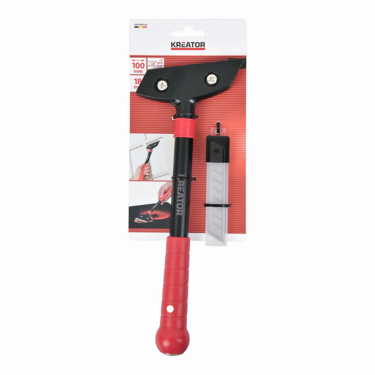 - Tuto dlouhou škrabku KRTH00502 z naší řady Kreator o délce 250 mm použijte k odstranění barvy, lepidla, samolepek z oken a zbytků jídla, které přilnuly na skleněných varných deskách (keramických, indukčních nebo plynových).