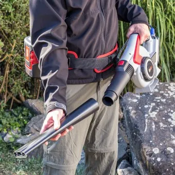 - S hmotností pouhých 3,6 kg (sakumulátorem) můžete s foukačem listí pracovat bez únavy. Napětí akumulátoru je 36 voltů, což má za znamená pracovní dobu 30 až 40 minut.