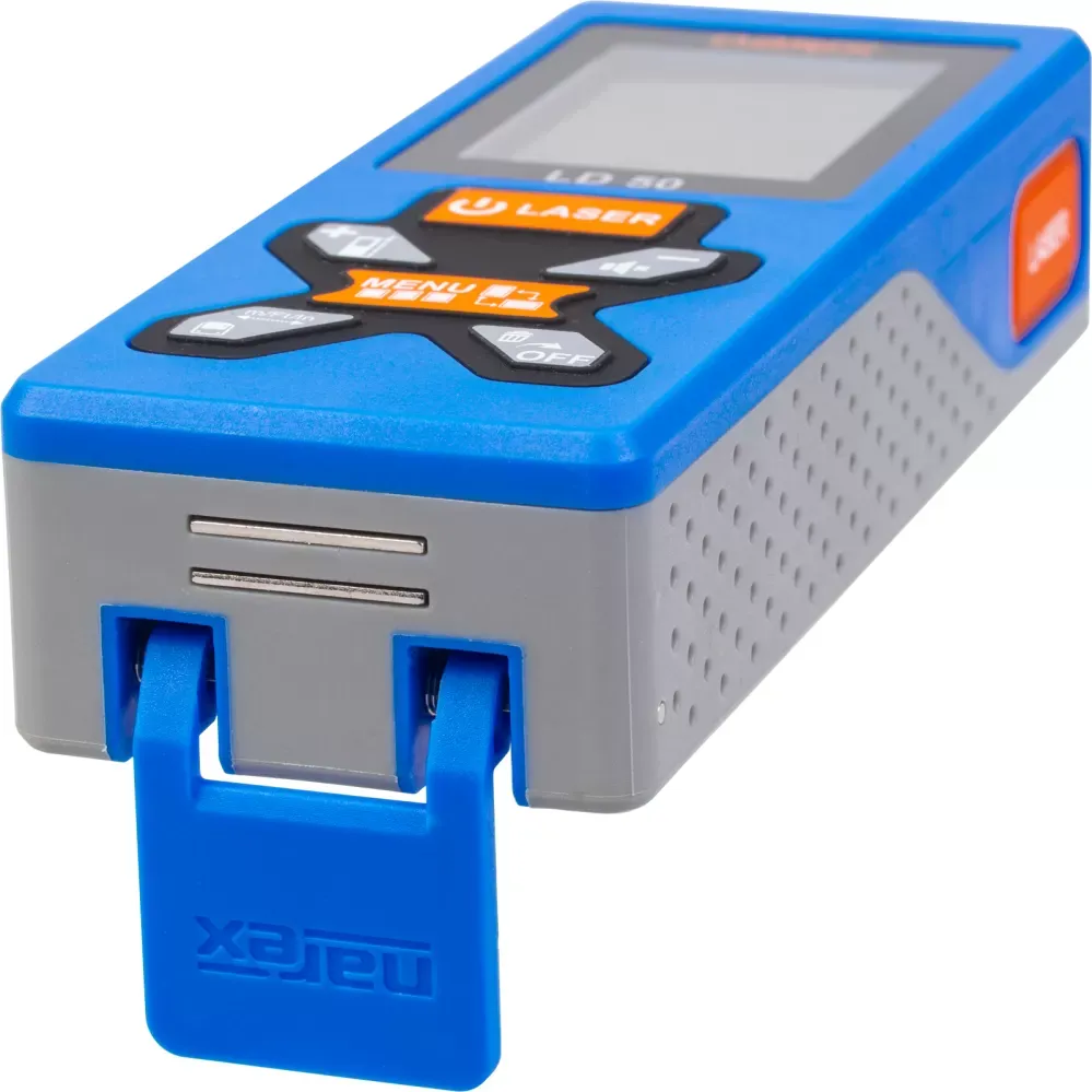 - Zabudované silné magnety umožňují vertikální nebo horizintální uchycení dálkoměru k feromagnerickým materiálům, zvyšují tak přesnost měření a zjednodušují celou řadu činností (např. instalatérská a sádrokartonářská činnost).