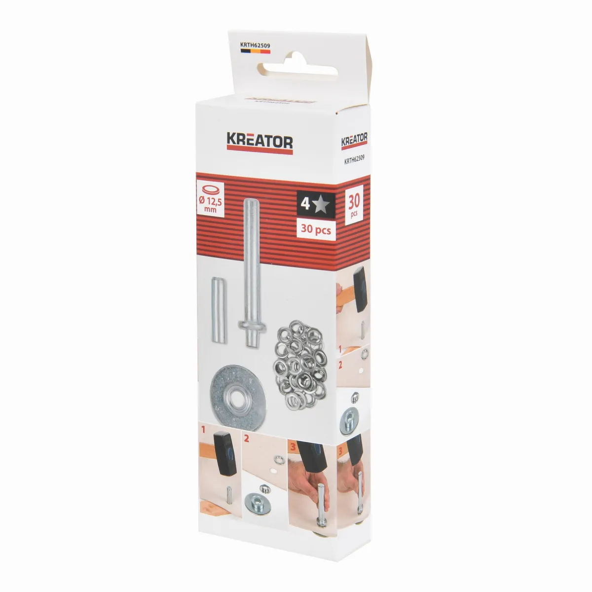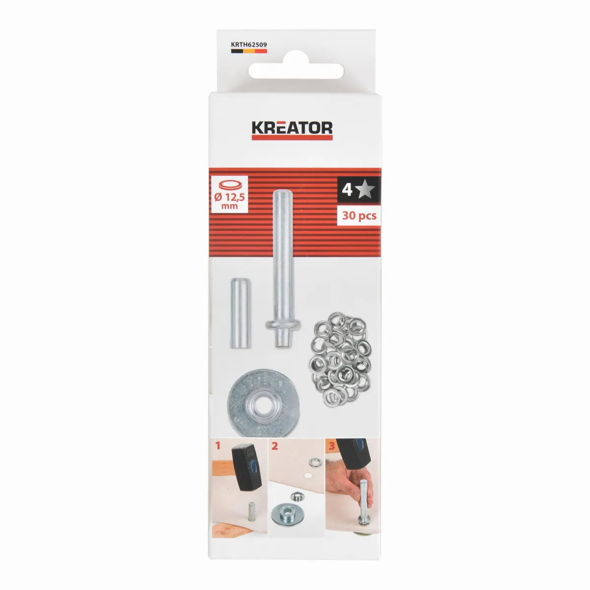- Tento ruční nástroj na nýtovací očka KRTH62509 od Kreator lze použít k připevnění oček s maximálním průměrem 12,5 mm k plachtám a jiným textiliím.