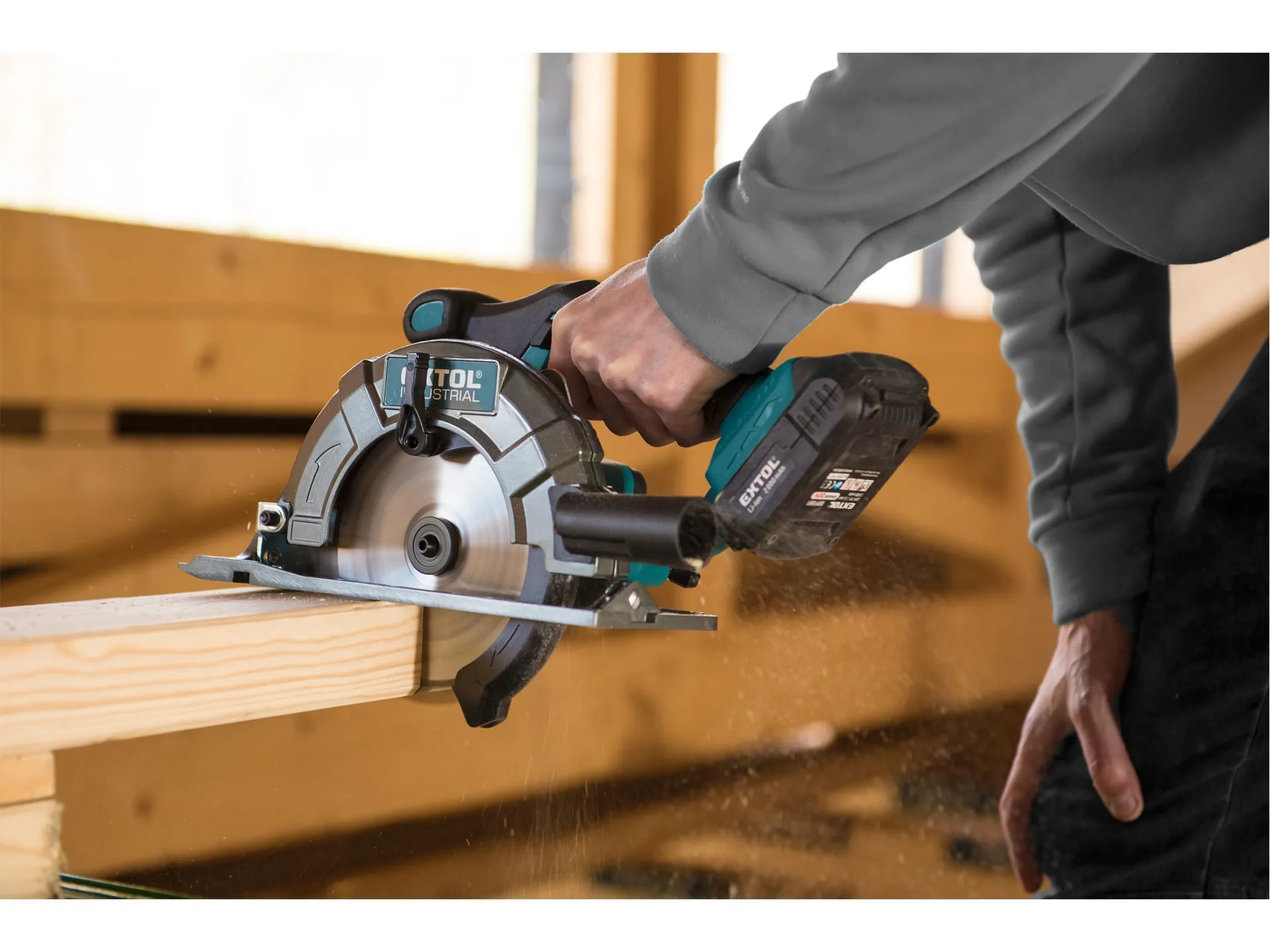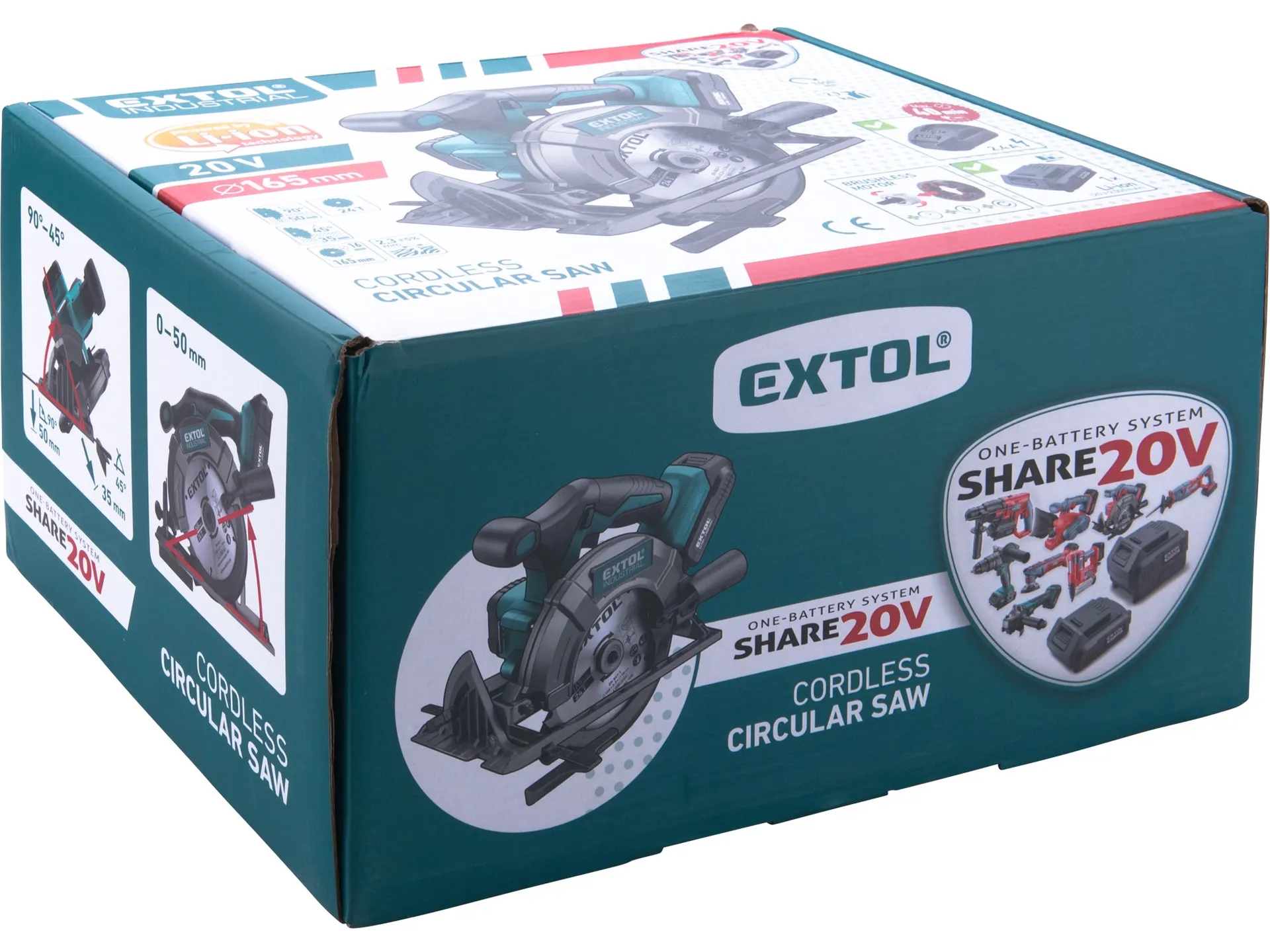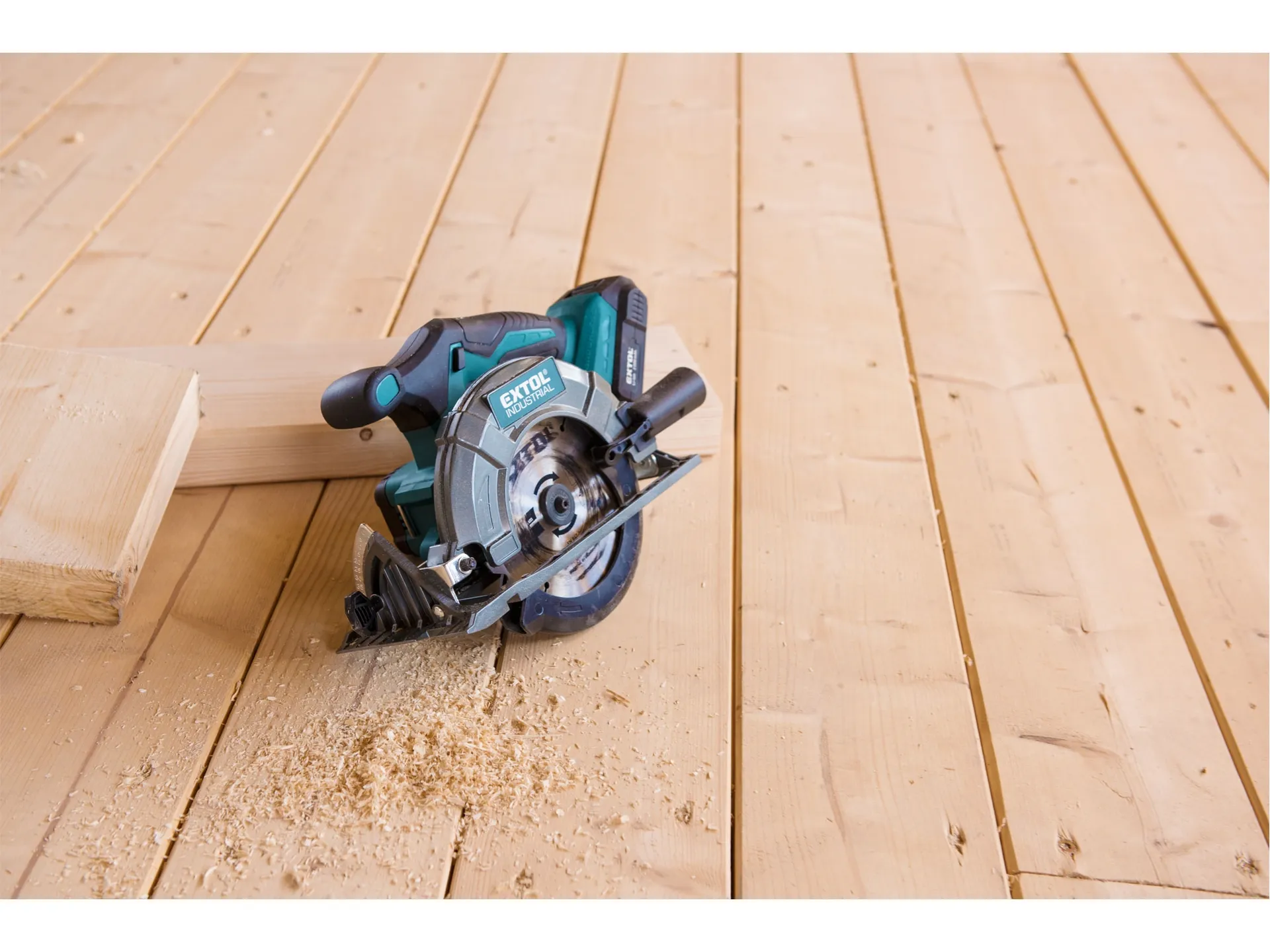- Brushless kotoučová pila je navržena tak, aby uživatelům poskytla výkonné a snadné řezání při různých instalatérských, elektrických, rámovacích, dokončovacích a tesařských pracích. Pila je poháněná nejmodernějším „brushless" motorem s 3650 ot./min umožňuje uživatelům rychle a snadno řezat tvrdým materiálem. Tento nový typ motoru má vyšší životnost, je výkonnější a má menší spotřebu el. energie než klasické motory s uhlíkovými kartáči. Horní a spodní kovový ochranný kryt poskytují vynikající ochranu kotouče při pádu. Gumová měkká rukojeť je ergonomicky navržena tak, aby uživatelům poskytovala vynikající pohodlí a vyvážení pro snadno ovladatelné řezy. Pro běžnou práci dostačují jeden nebo dva 2000mAh akumulátory, které můžete rychle nabít v rychlonabíječce, pro náročnější nebo delší práci doporučujeme větší akumulátory s kapacitou 4000–8000mAh. Akumulátor lze použít ve všech typech nářadí řady EXTOL SHARE20V. Díky použité Li-ion technologii je ho možné kdykoliv dobíjet, aniž by se tím snižovala jeho kapacita. Li-ion akumulátor ztrácí energii vlivem samovybíjení velmi pomalu a vydrží dlouho nabitý a připravený k použití.