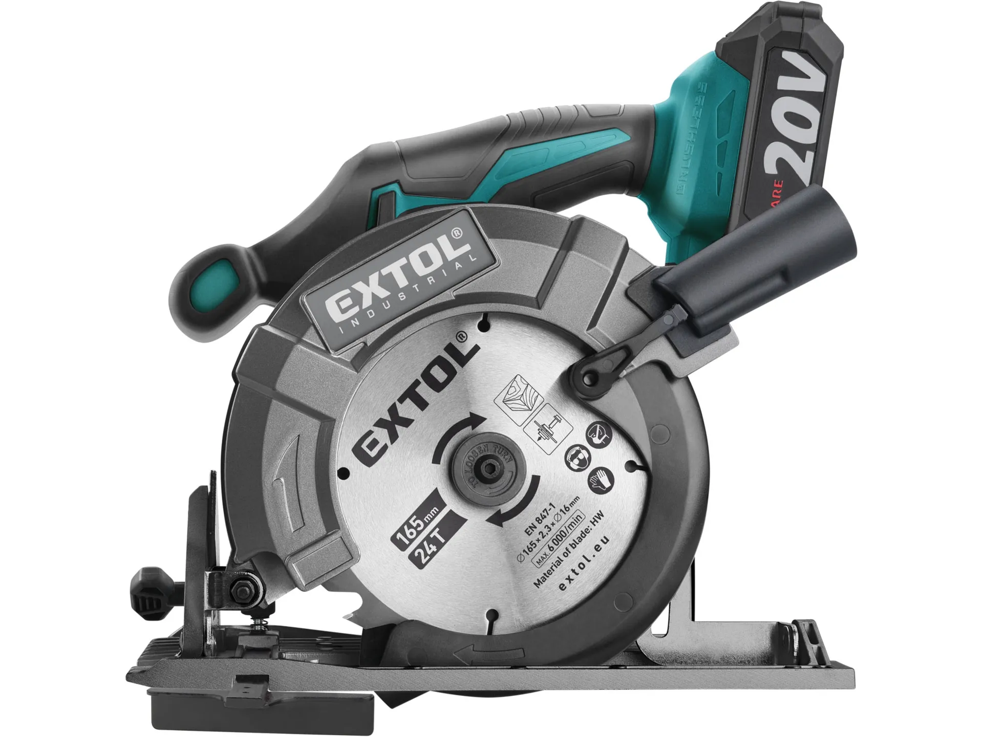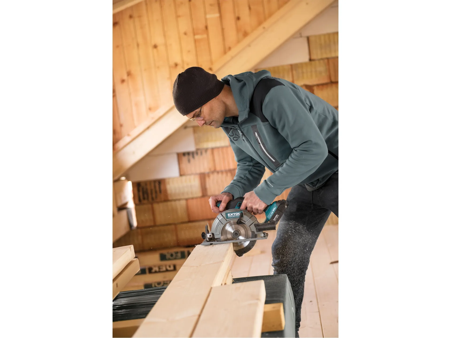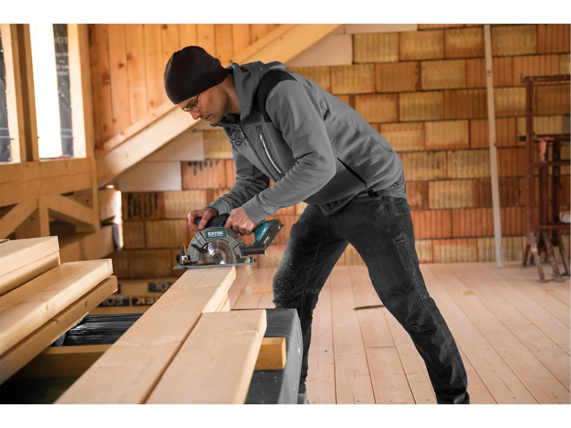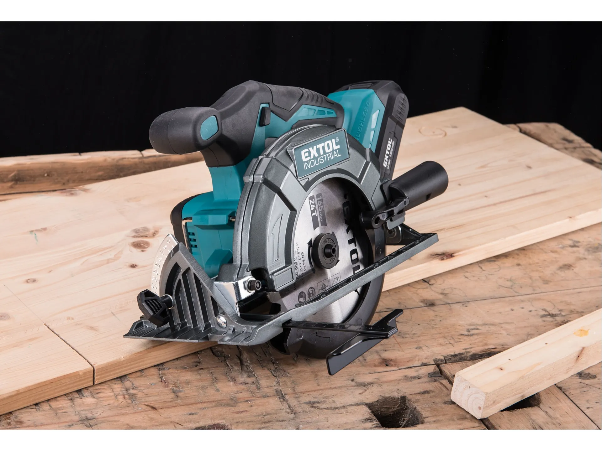 - Brushless kotoučová pila je navržena tak, aby uživatelům poskytla výkonné a snadné řezání při různých instalatérských, elektrických, rámovacích, dokončovacích a tesařských pracích. Pila je poháněná nejmodernějším „brushless" motorem s 3650 ot./min umožňuje uživatelům rychle a snadno řezat tvrdým materiálem. Tento nový typ motoru má vyšší životnost, je výkonnější a má menší spotřebu el. energie než klasické motory s uhlíkovými kartáči. Horní a spodní kovový ochranný kryt poskytují vynikající ochranu kotouče při pádu. Gumová měkká rukojeť je ergonomicky navržena tak, aby uživatelům poskytovala vynikající pohodlí a vyvážení pro snadno ovladatelné řezy. Pro běžnou práci dostačují jeden nebo dva 2000mAh akumulátory, které můžete rychle nabít v rychlonabíječce, pro náročnější nebo delší práci doporučujeme větší akumulátory s kapacitou 4000–8000mAh. Akumulátor lze použít ve všech typech nářadí řady EXTOL SHARE20V. Díky použité Li-ion technologii je ho možné kdykoliv dobíjet, aniž by se tím snižovala jeho kapacita. Li-ion akumulátor ztrácí energii vlivem samovybíjení velmi pomalu a vydrží dlouho nabitý a připravený k použití.