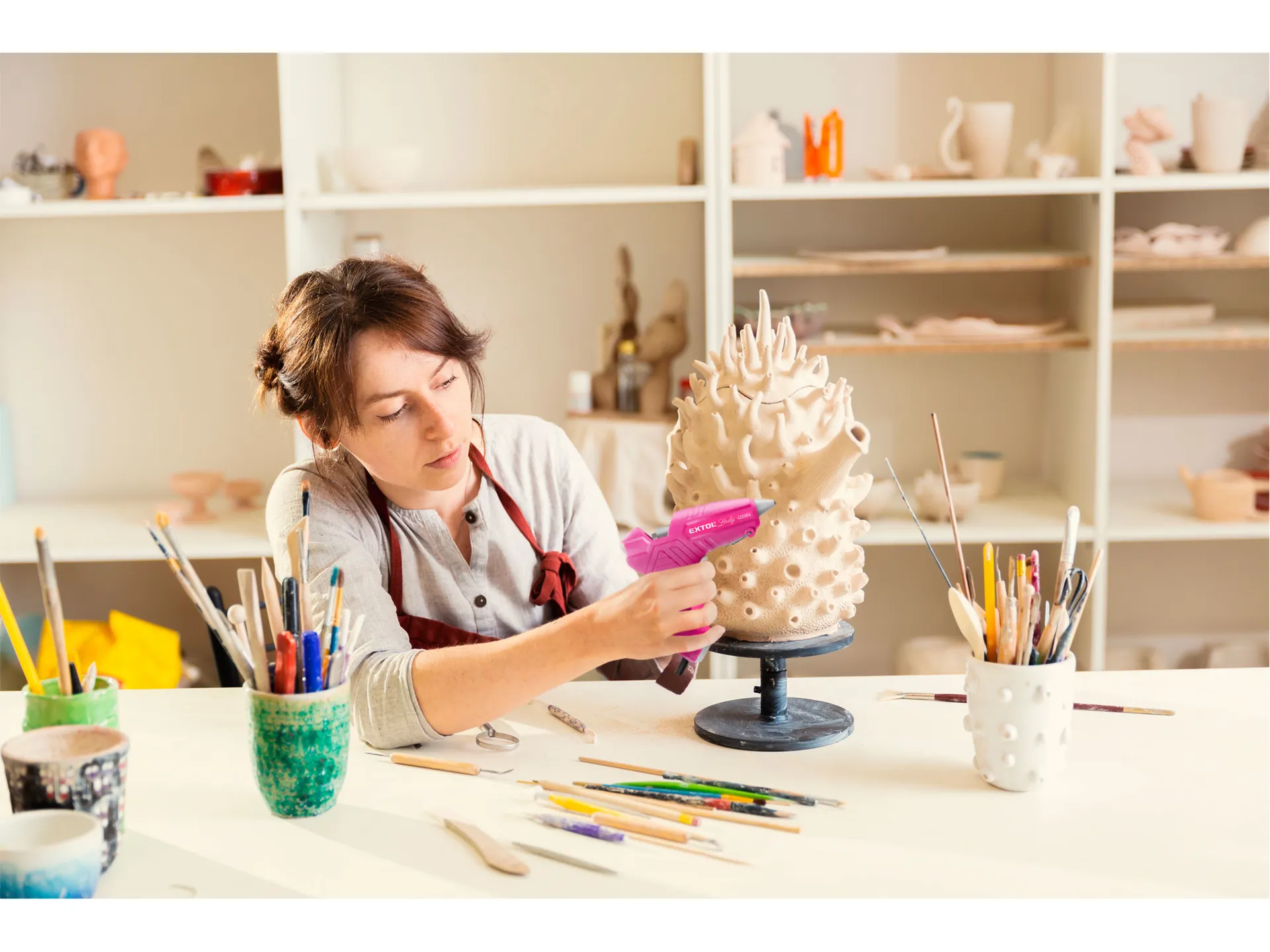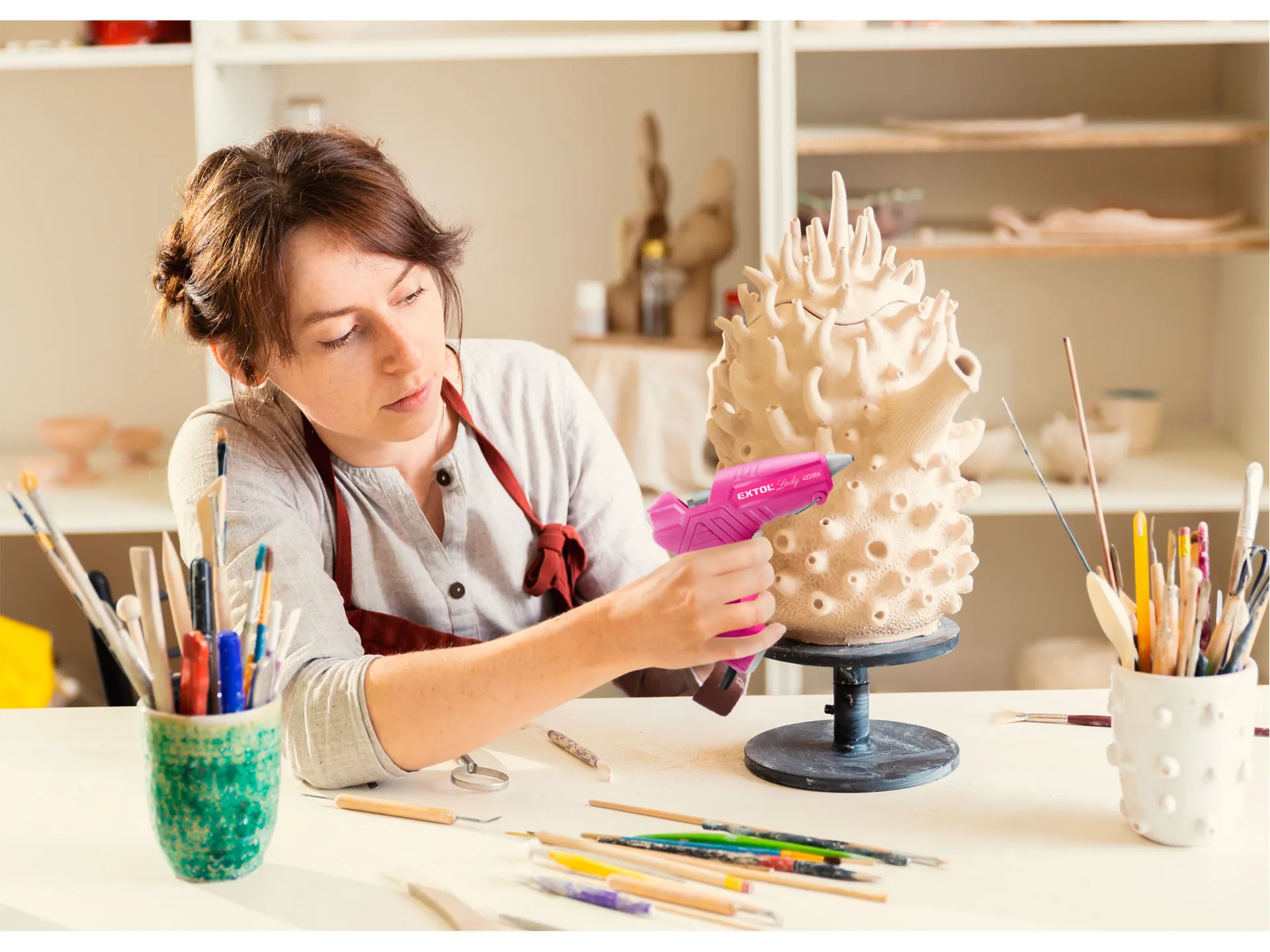 • Lepící tavná pistole je určena k rychlému slepení papíru, korku, dřeva, kůže, textilie, umělé hmoty, keramiky atd. Páčka mechanického posuvu umožňuje citlivé, plynulé a přesné dávkování roztaveného lepidla na požadované místo.