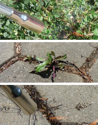- Díky rychlému nárůstu teploty se roztáhne buněčná kapalina, buněčná stěna se roztrhne, bílkovina se srazí a plevel hyne. Po několika dnech rostlina zvadne a může být odstraněna. U určitých rostlin, které jsou velmi odolné, je vhodné proces s odstupem cca tří týdnů zopakovat. Použití vypalovače plevele je naprosto netoxické a díky tomu se nemohou do okolí (zvířata, potraviny, vodstvo) dostat žádné škodlivé látky.