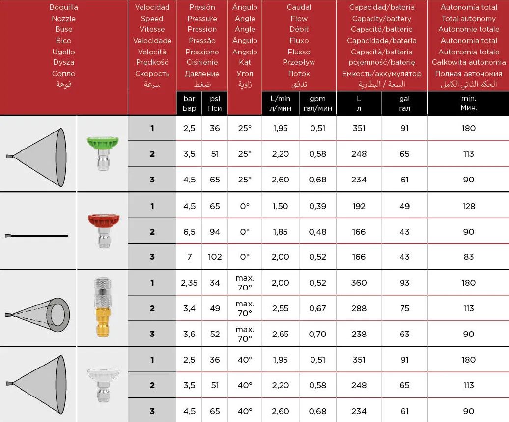 - Postřikovač nabízí tři volitelné stupně výkonu s maximálním pracovním tlakem až 7 bar. Zvolený stupeň udržuje konstantní tlak a velikost kapek, což zajišťuje vysokou kvalitu a efektivitu aplikace. Výkonná baterie a čerpadlo postřikovače umožňuje práci až po dobu 3 hod.
