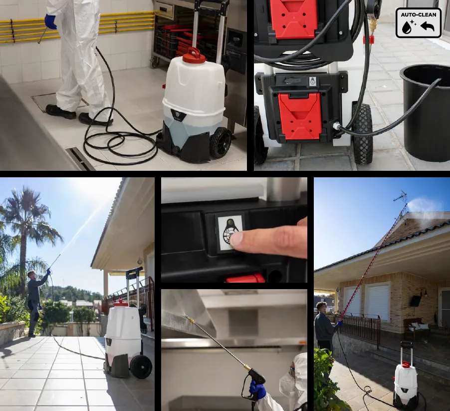 - Model Industrial 35 disponuje navíc systémem "Auto-clean" umožňující samočištění vnitřních komponentů stroje bez nutnosti vyprázdnění postřikové nádrže. Tento systém pomáhá předcházet usazování chemických zbytků a vzájemné kontaminaci různých chemických postřiků mezi jednotlivými aplikacemi.