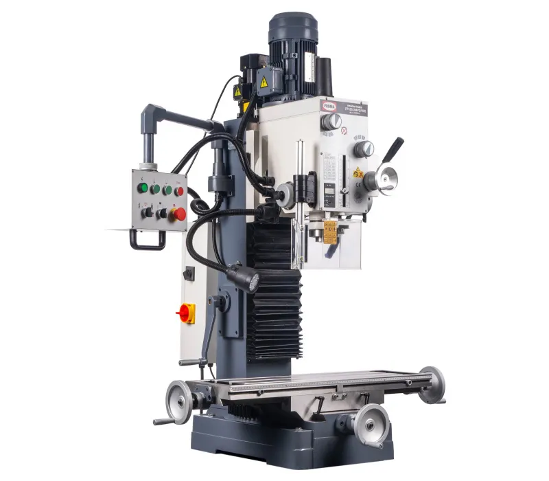 - Velký křížový stůl s T-drážkami a přesně opracovaným povrchem Závitovací cyklus díky nožnímu ovladači pro změnu směru otáčekMnohostranné použití stroje například - vrtání závitů, frézování drážek, atd. Nastavitelné rybinové vedení v osách X, Y a Z Plynulé nastavení otáček od 100 do 2250 ot./min Digitální zobrazení zdvihu pinoly Oboustranně otočná frézovací hlava ±90° Broušená ozubená převodová kola pro velice klidný chod frézky Stabilní základna z šedé litiny zajišťuje chod bez vibrací BLDC bezuhlíkový motor 750W s optimálním krouticím momentem i při nižších otáčkách Jemné nastavení pinoly při frézování pomocí ovládacího ručního kola Přehledně umístěné ovládací a řadicí prvkySoučásti dodávky vrtačko-frézky PROMA FP-20MZ/230