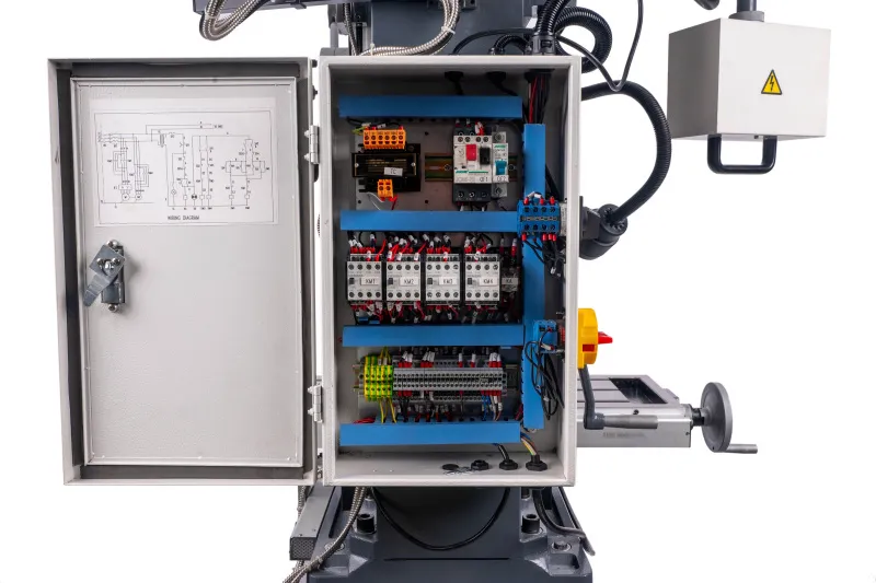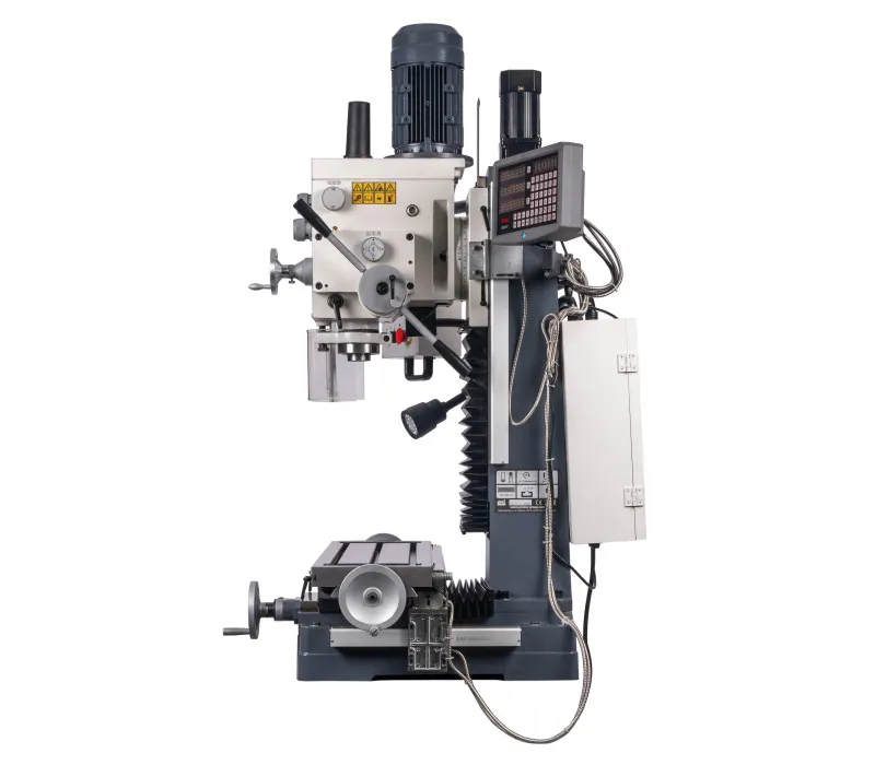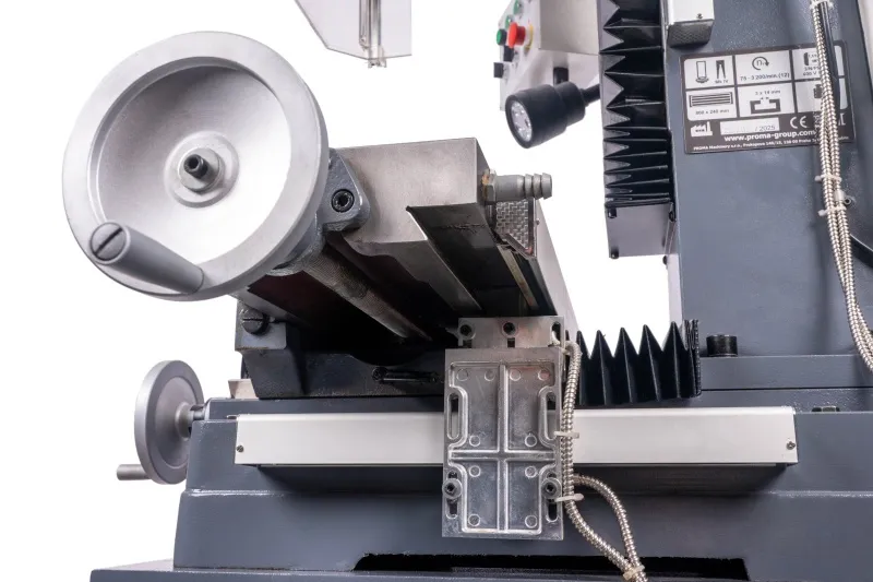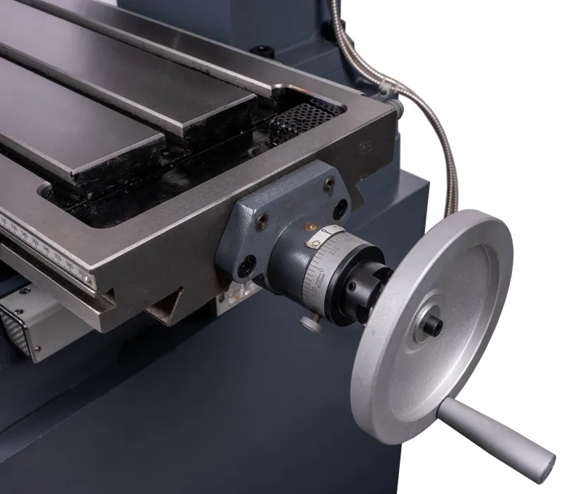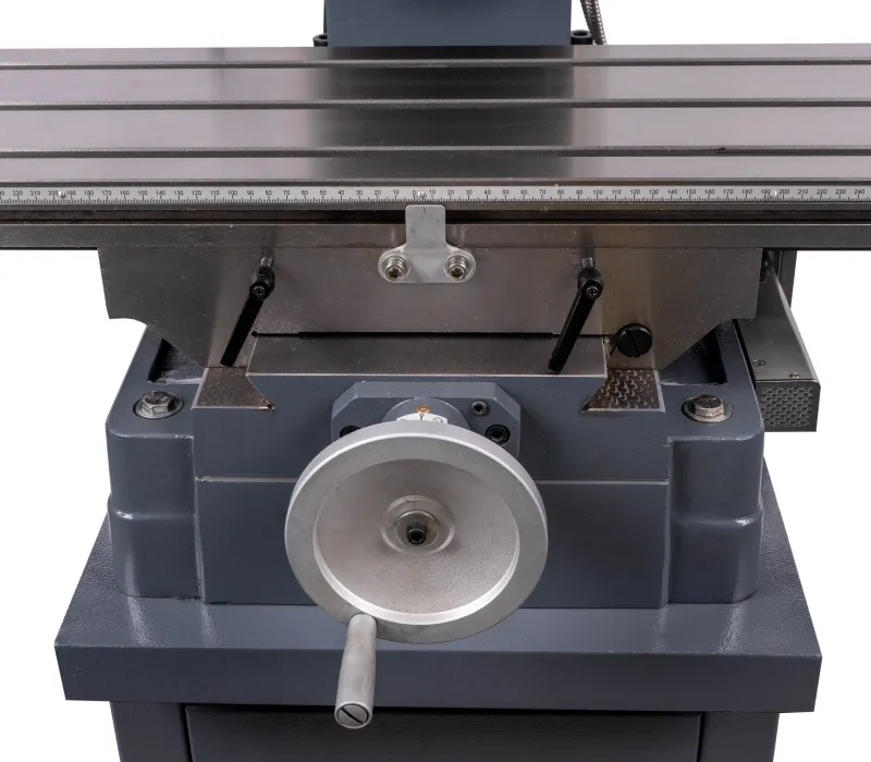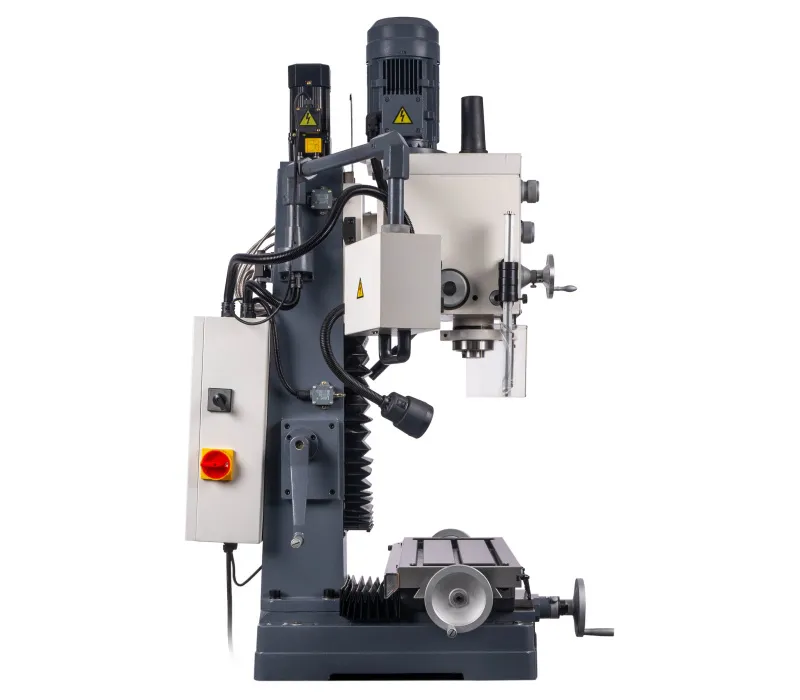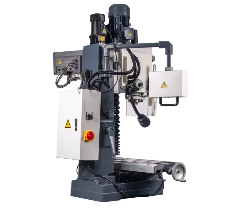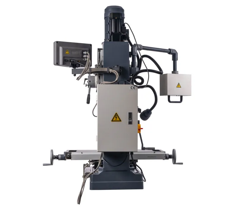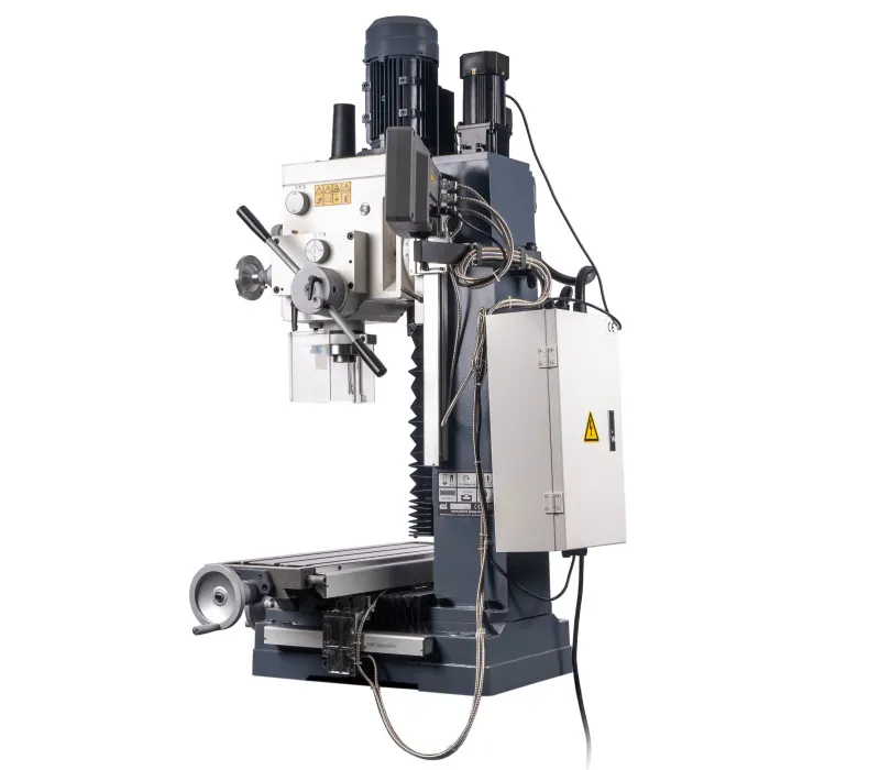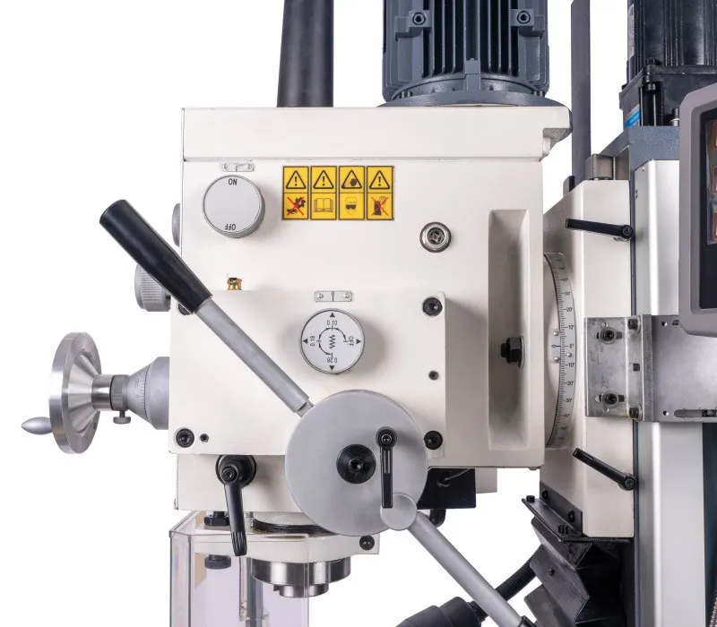 - Výškově přestavitelná frézovací hlava, sklopná o ±45° Pravý - levý chod + automatický posuv pinoly Digitální odměřování D.R.O. ve třech osáchDigitální odměření vysunutí pinoly Závitovací cyklus LED pracovní osvětleníVysoká bezpečnost je zajištěna výškově stavitelným krytem sklíčidla s mikrospínačem Klidný a tichý chod díky broušeným převodovým ozubeným kolům, běžícím v olejové lázni Převodovka s 6 rychlostmi v kombinaci s 2 rychlostním motorem získá 12 stupňů převodů Vysoký rozsah otáček díky kombinaci motoru a převodovky Rybinovité vedení pro osu X, Y a Z, nastavitelné pomocí klínových lišt Přestavení pinoly rukojetí, jemné nastavení ručním kolem Dvourychlostní motor s vysokým točivým momentem Masivní velký křížový stůl s přesně opracovaným povrchem