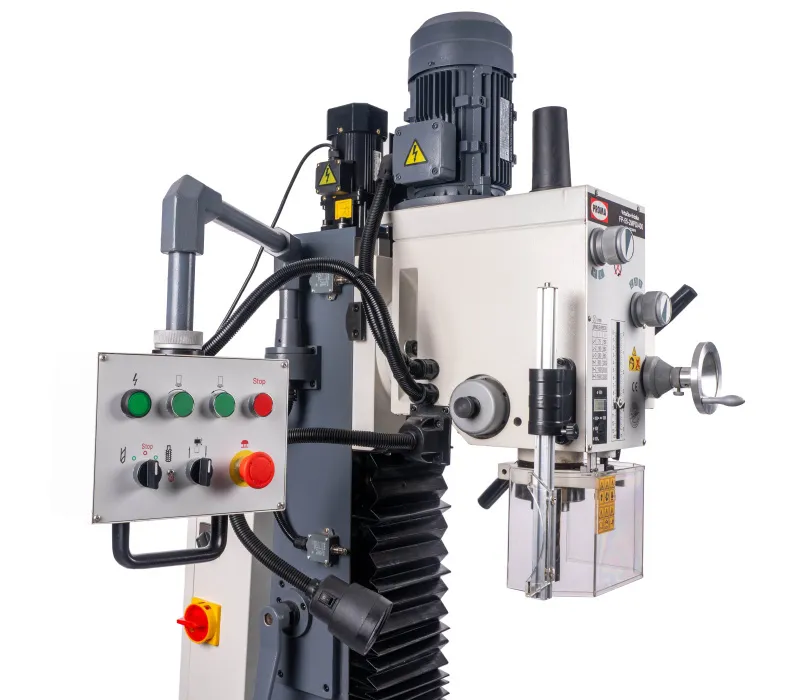 - Výškově přestavitelná frézovací hlava, sklopná o ±45°Pravý - levý chodVysoká bezpečnost je zajištěna výškově stavitelným krytem sklíčidla s mikrospínačem Klidný a tichý chod díky broušeným převodovým ozubeným kolům, běžícím v olejové lázniRybinovité vedení pro osu X, Y a Z, nastavitelné pomocí klínových lišt Přestavení pinoly rukojetí, jemné nastavení ručním kolem Motor s vysokým točivým momentem Masivní velký křížový stůl s přesně opracovaným povrchemSoučásti balení vrtačko - frézky PROMA FP-45M/400
