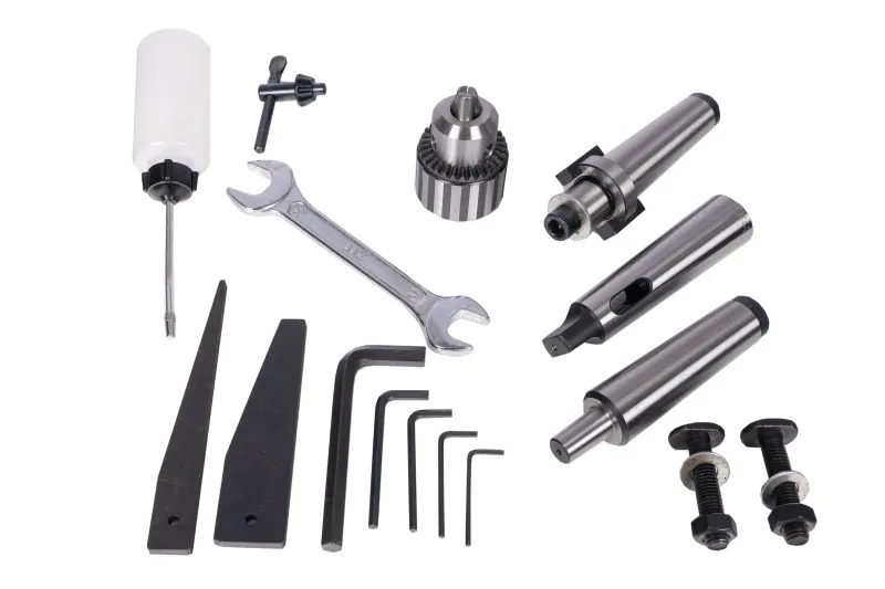 - Digitální odměřování posuvu pinolyNožní spínač pro reverzaci otáčekSklíčidlo 1-16mm / B16Upínací trn MK 2 / B 16 Upínací tyč vřetene se závitem M10 Ochranný kryt vřeteneServisní a obslužné nářadí