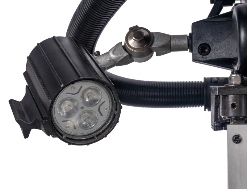 - Ochranné prvky stroje odpovídají platným ISO normám, zahrnují tlačítko pro nouzové zastavení stroje, ochranný kryt vřetene a bezpečnostní vypínače pod ochrannými kryty.