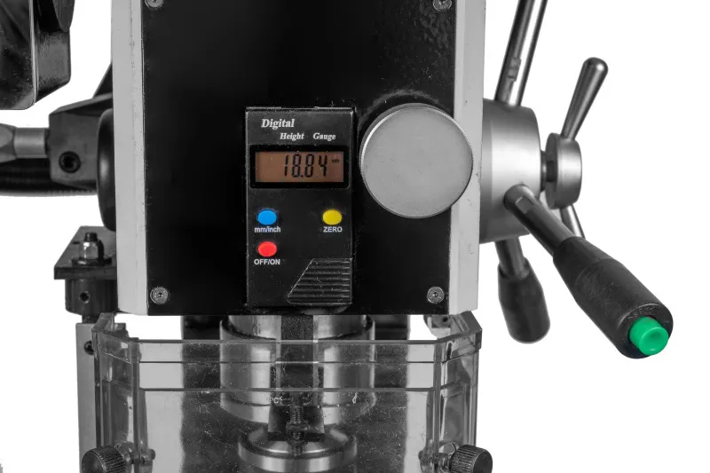 - Stroj je vybaven výkonným bezuhlíkovým DC motorem, plynulou regulací otáček s digitálním ukazatelem, digitálním odměřením vysunutí pinoly a reverzací chodu motoru pro snadné závitování.