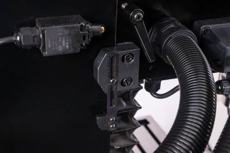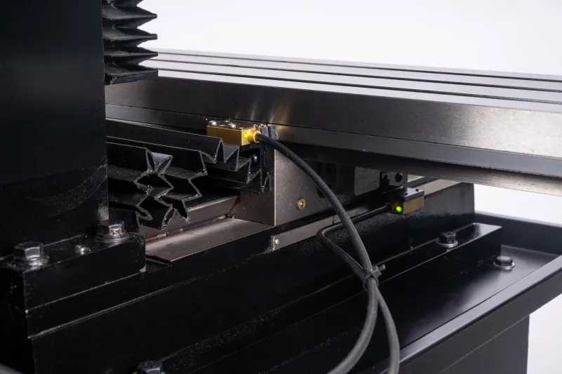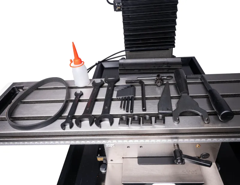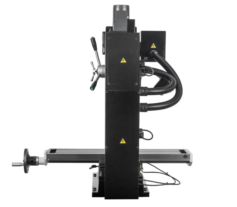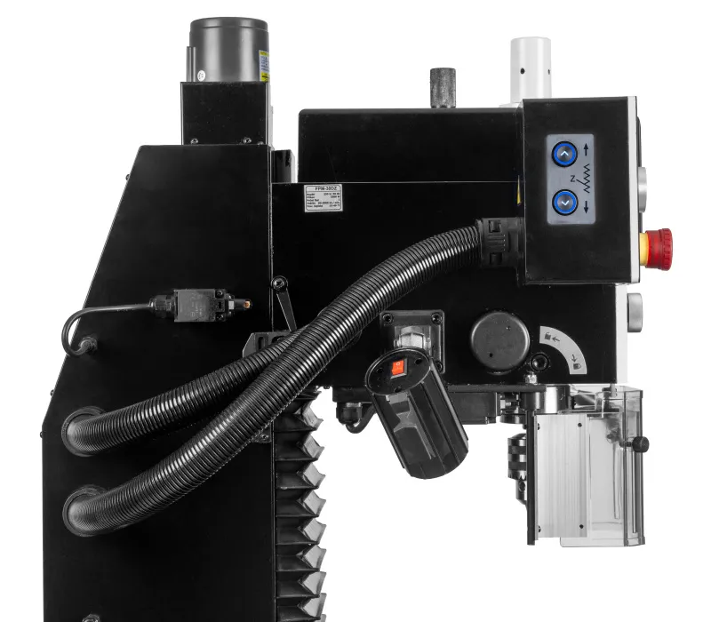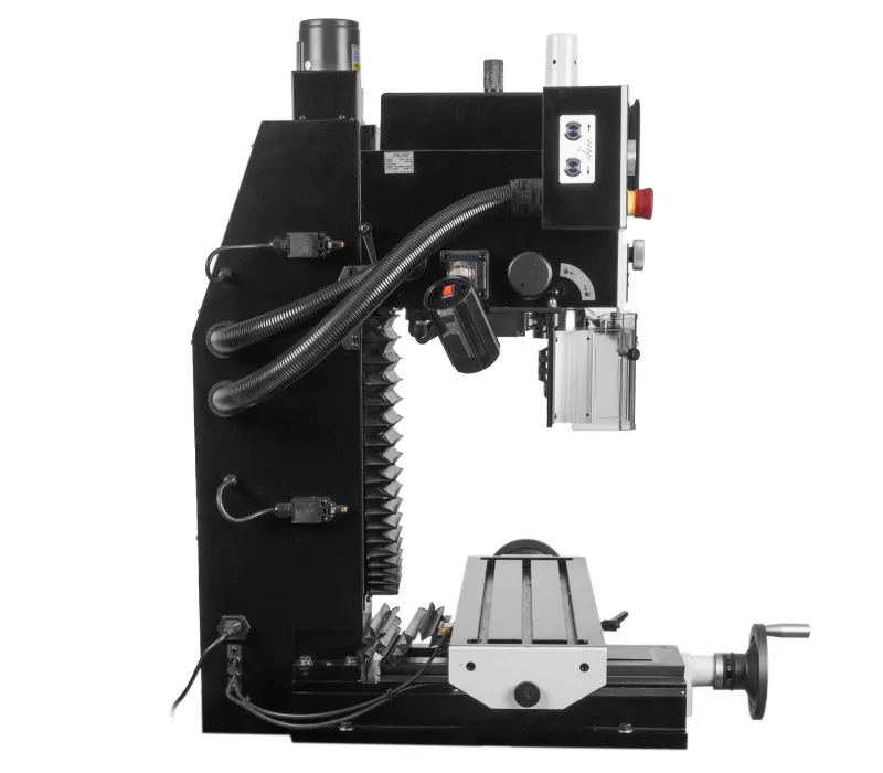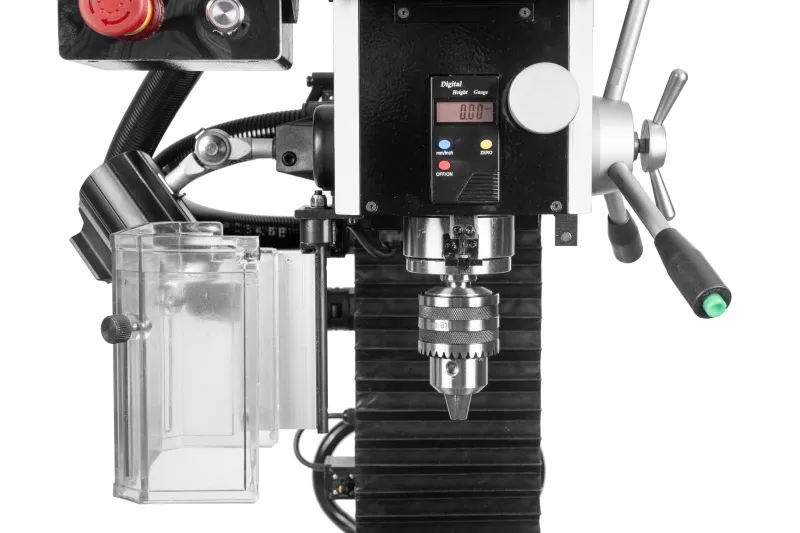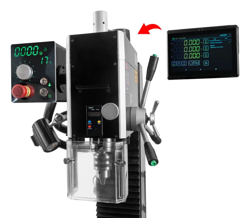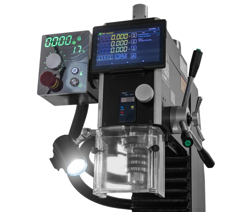 - Stroj je vybaven výkonným bezuhlíkovým DC motorem, plynulou regulací otáček s digitálním ukazatelem, digitálním odměřením vysunutí pinoly a reverzací chodu motoru pro snadné závitování a DRO digitálním odměřováním třech os. Ochranné prvky stroje odpovídají platným ISO normám, zahrnují tlačítko pro nouzové zastavení stroje, ochranný kryt vřetene a bezpečnostní vypínače pod ochrannými kryty.