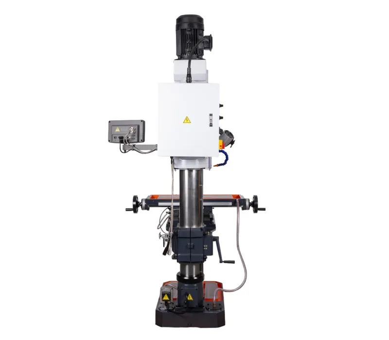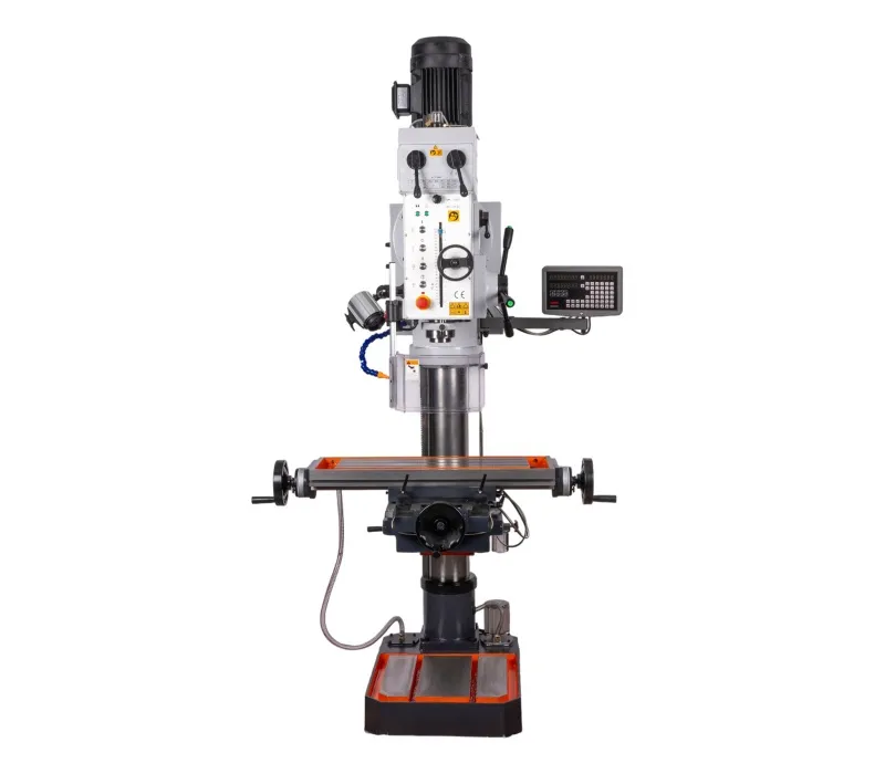 - Křížový stůl s chladícími drážkami Dvourychlostní motor12 rychlostí otáček vřetene, strojní posuv vřetene, závitovací cyklus v základní výbavě Vysoká bezpečnost práce díky výškově nastavitelnému ochrannému krytu podle normy CE Vysoká variabilita prací díky křížovému stolu Zvýšená produktivita díky digitálnímu odměřování polohy ve 2 osách Přesně opracovaná základna s T-drážkami pro upnutí a obrábění zejména vysokých obrobků Integrované čerpadlo chladicí kapaliny Přesná valivá ložiska zajišťují vysokou přesnost běhu ≤ 0,02 mm - měřeno na pinole Snadná výměna nástroje pomocí automatického vyhazovače/vyrážeče nástrojů Integrované osvětlení a přepínač směru otáčení vpravo/vlevo pro řezání závitů 4 velikosti automatického posuvu pinoly přepínatelné pomocí elektromagnetické spojky