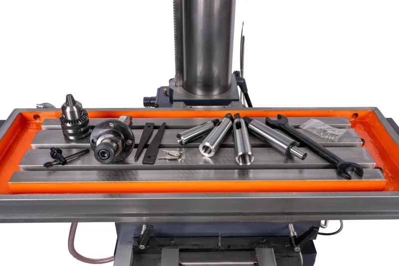 - Digitální odměřování dvou os s digitálním displejem Zubové sklíčidlo 1 ÷ 13 mm / B 16 Kuželový trn MK 4 / B 16 Redukce MK 4 / MK 3, MK 4 / MK 2, MK 3 / MK 1 Kombinovaný upínací trn MK 4 / 27 mm Chladicí zařízení Elektromagnetický posuv pinoly Závitovací zařízení Automatický vyrážeč nástrojů LED pracovní osvětlení Prvotní olejová náplň Výškově stavitelný ochranný kryt Servisní a obslužné nářadí