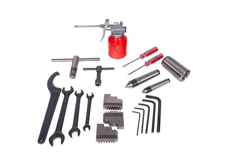 - 3-čelisťové sklíčidlo 125 mm Sada vnitřních čelistí Sada vnějších čelistí 4-stranný otočný nožový držák Pevný hrot MK 2 Vana na třísky Stěna ostřiku Digitální ukazatel otáček vřetena Sada výměnných ozubených kol Servisní a obslužné nářadí v plastovém kufru Olejnička Náhradní pojistky