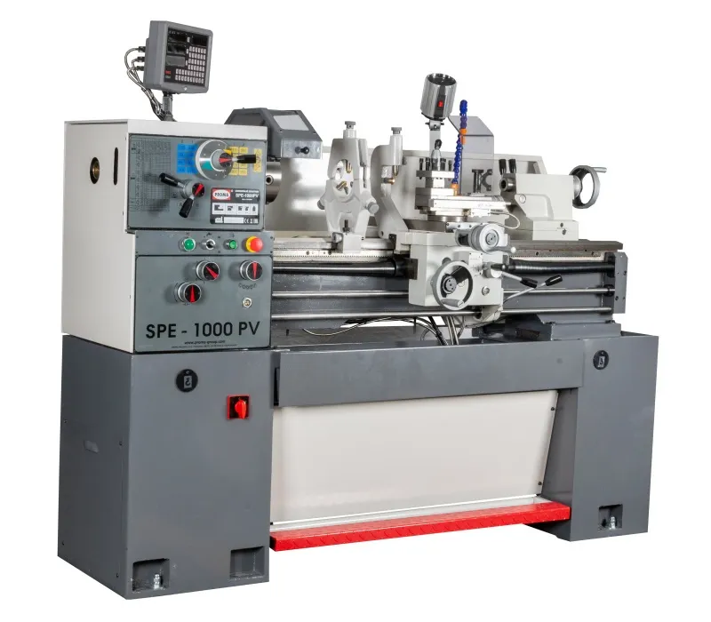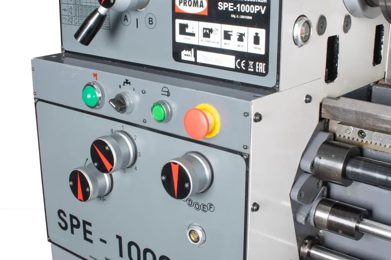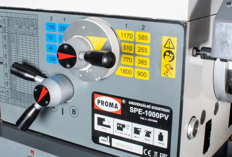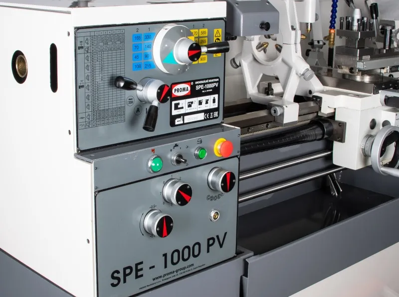 - Soustruh PROMA SPE-1000PV spadá do skupiny strojů, které jsou učeny pro náročné zámečnické a opravárenské dílny a školy. Díky silné konstrukci lože a hmotnosti přes 840 kg nabízí stabilní pracovní výkony. Tento typ stroje je standardně vybaven jak vodicím a tažným vřetenem pro řezání závitů, dvourychlostním motorem, tak i automatickým podélným a příčným posuvem.