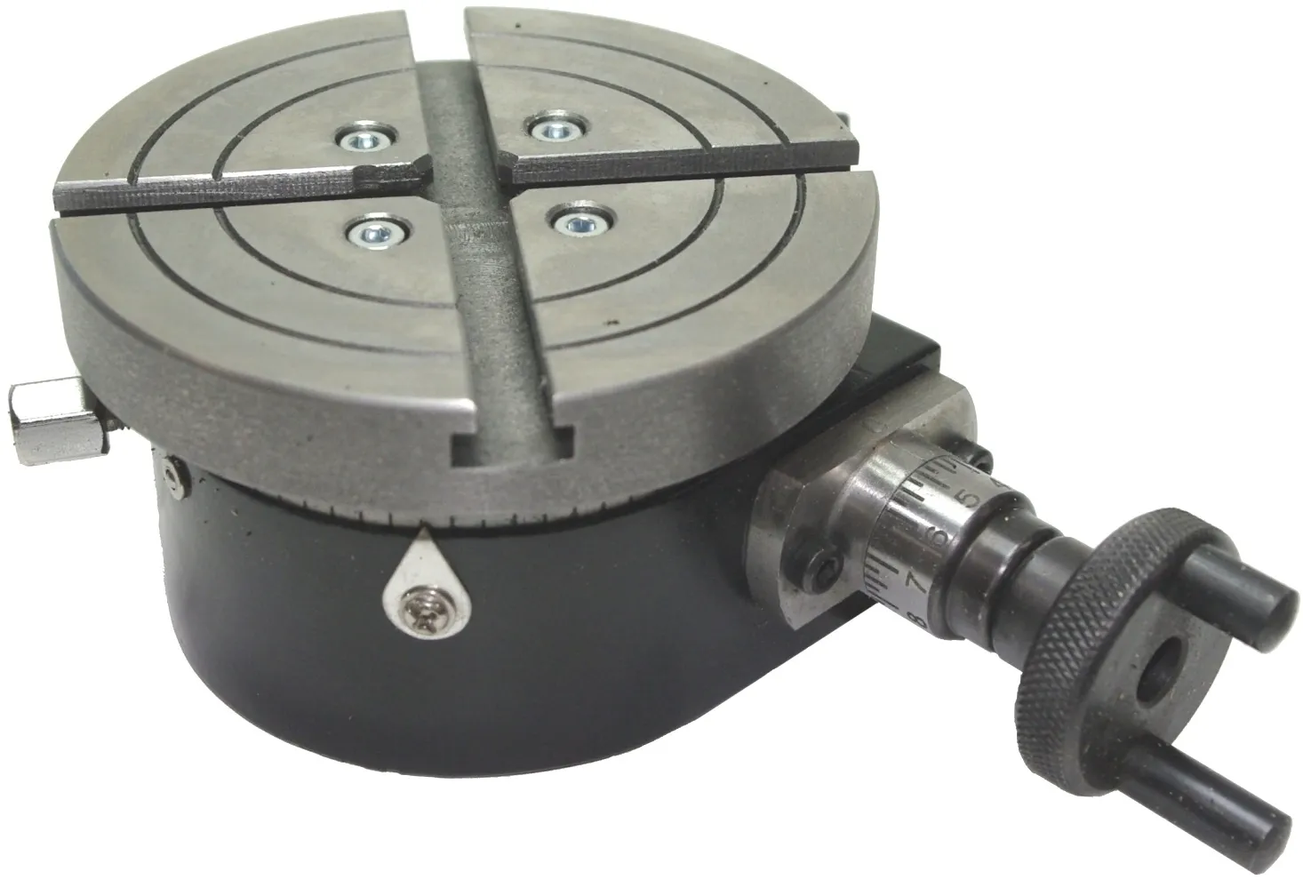- Nastavení posuvu regulačním kolečkem se stupnicí s nastavitelnou nulou (1 otáčka = 10°). Zařízení lze upnout vertikálně nebo horizontálně ke křížovému stolu s T-drážkou v rozmezí 45 – 60 mm.