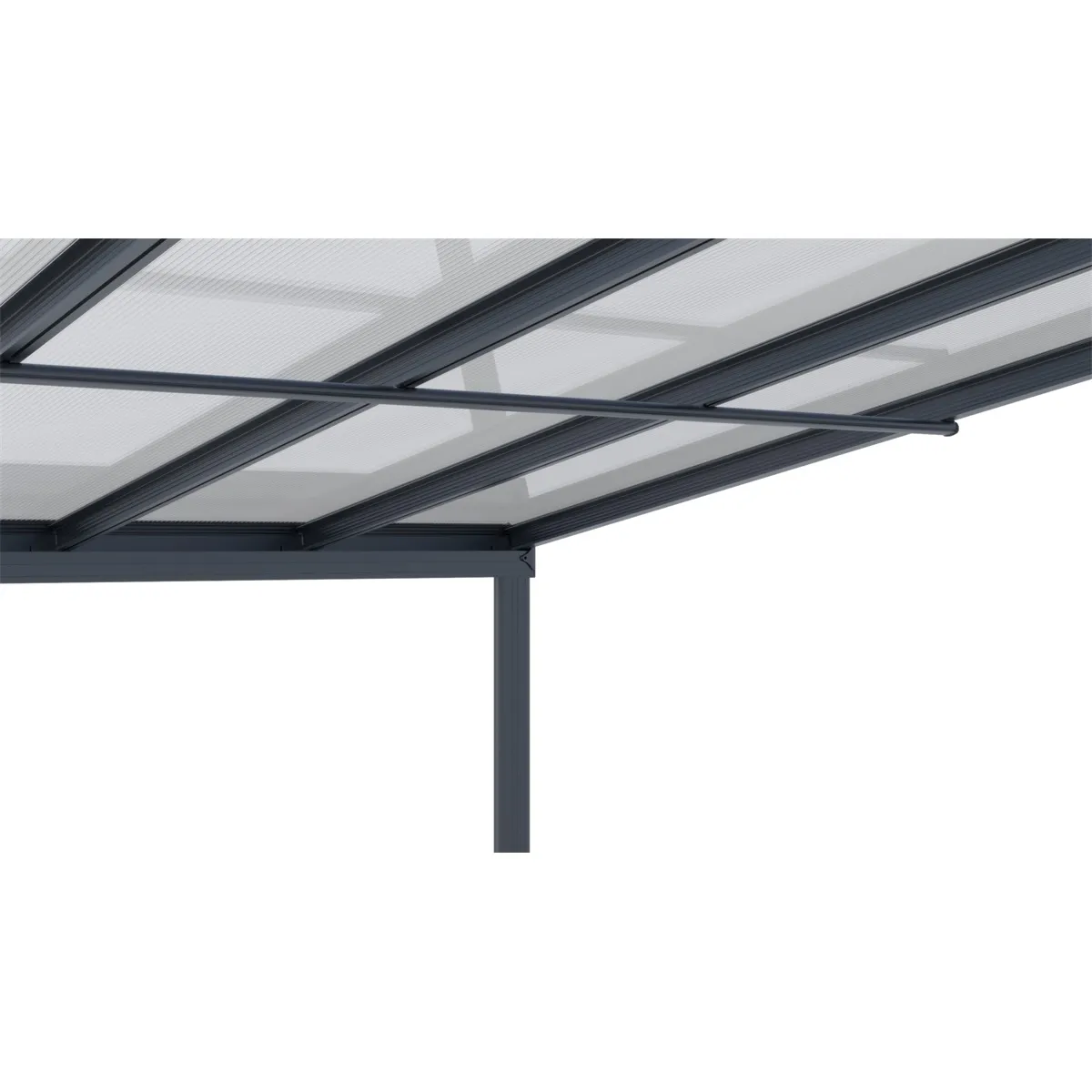 - Střecha je osazena 6mm dvoukomůrkovým polykarbonátem v šedém odstínu, který je vybaven UV ochranou. Propouští dostatek přirozeného světla, ale zároveň účinně chrání před deštěm, slunečním zářením i nepříznivým počasím. Barevné provedení střechy harmonicky ladí s antracitovou konstrukcí a vytváří moderní a elegantní celek. Pro zvýšení odolnosti je pergola vybavena také dodatečným střešním vyztužením, které přispívá k vyšší pevnosti při zatížení větrem či sněhem.