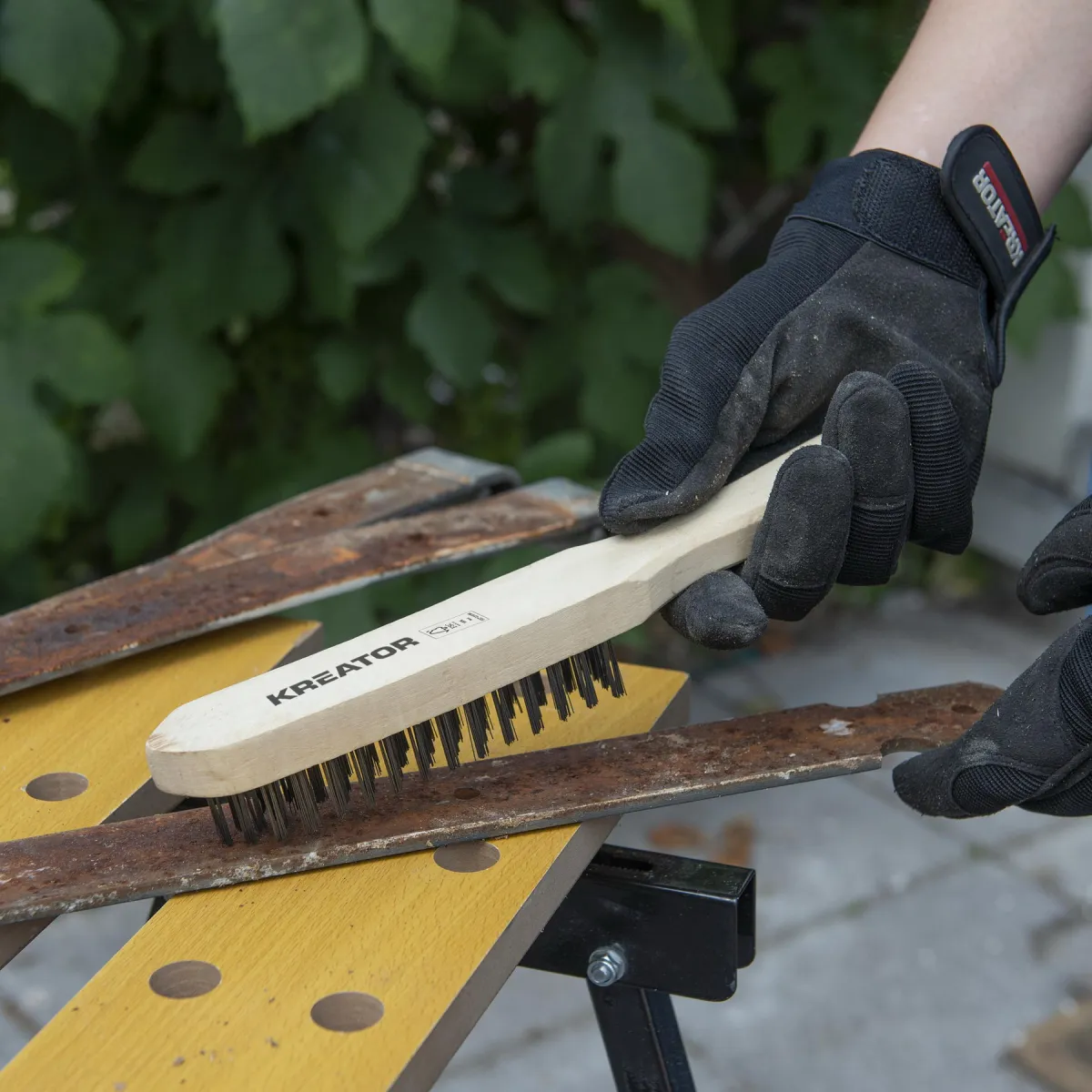 - Tento dřevěný drátěný kartáč KRTH50002 z naší řady Kreator má 56 řad ocelových štětin pro odstranění nečistot a rzi z kovu.