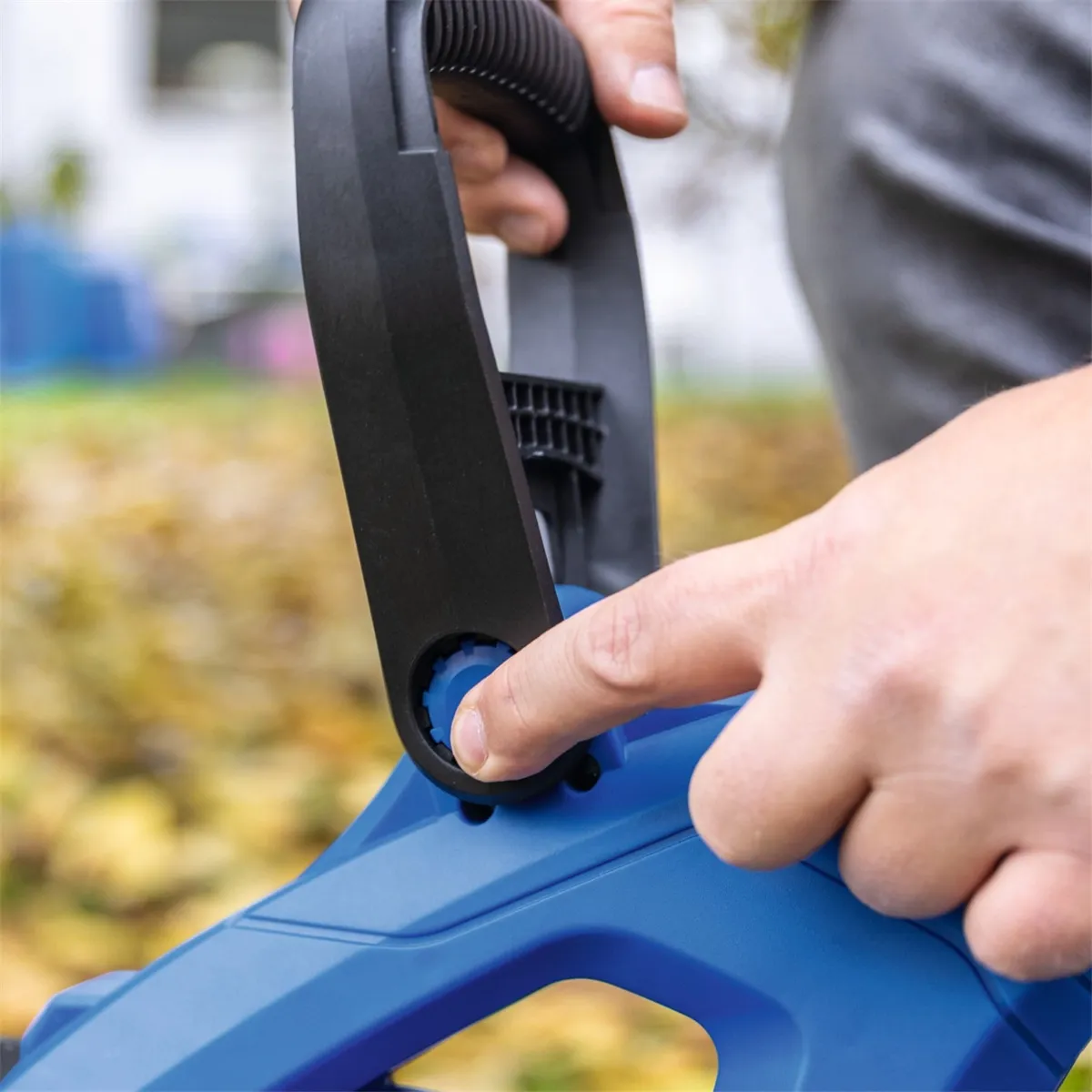 - Zařízení je vybaveno 45 litrovým sběrným vakem s praktickým okénkem pro kontrolu naplnění. Přepnutí mezi režimy foukání a vysávání je rychlé a nevyžaduje žádné nástroje. Ergonomický design zahrnuje nastavitelnou rukojeť, měkčenou protiskluzovou úpravu madla a nosný popruh pro pohodlné nošení i při delší práci. Velká vodicí kola umožňují snadné ovládání a lehký pohyb po zahradě.