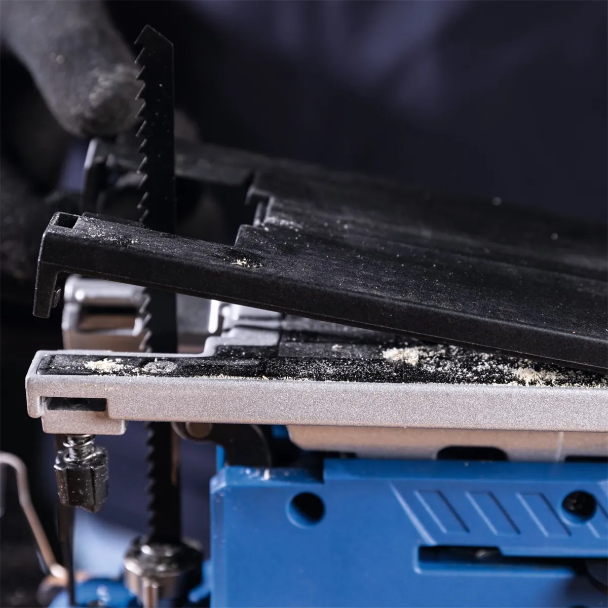 - Konstrukce pily umožňuje řezat v mnoha různých úhlech, provádět dlouhé paralelní řezy nebo obloukové řezy. Stroj má snadné jednoruční ovládání, elektronické nastavení rychlosti, funkci ofukování pracovního prostoru, LED osvětlení pracovního prostoru s 10 s prodlevou po vypnutí stroje a 3-stupňové nastavení předkmitu pro nastavení rychlosti řezání.