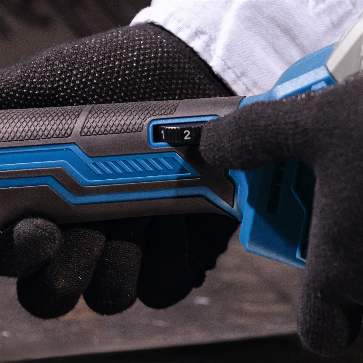 - Bruska umožňuje nastavení otáček v šesti stupních v rozsahu 2 500 až 10 000 ot/min, což zaručuje přesné přizpůsobení danému materiálu a aplikaci. Přední rukojeť lze nastavit do tří poloh a je vybavena integrovaným držákem na montážní klíč, což zvyšuje komfort a rychlost při výměně kotouče. Snadnou výměnu nástroje zajišťuje praktická aretace vřetene. Model disponuje standardním upínáním M14 a je určen pro kotouče s průměrem 125 mm.