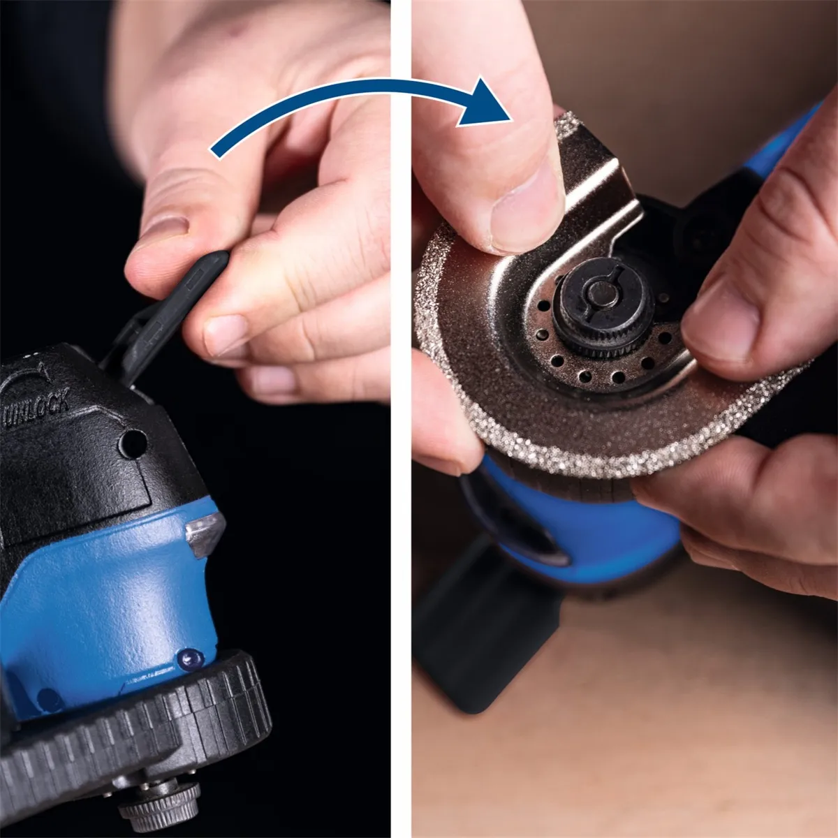 - Multifunkční nástroj je vybaven moderním uhlíkovým motorem zajišťující plynulý chod. S proměnnou rychlostí oscilace nastavitelnou v šesti úrovních (10 000 až 40 000 otáček za minutu) se přizpůsobí každé pracovní situaci. Nastavitelný směr uchycení příslušenství zajišťuje snadný přístup i k těžko dostupným místům. Robustní kovové převody zaručují dlouhou životnost a odolnost i při plnění náročných úkolů. Oscilační úhel 3,2° umožňuje precizní práci při různých aplikacích.
